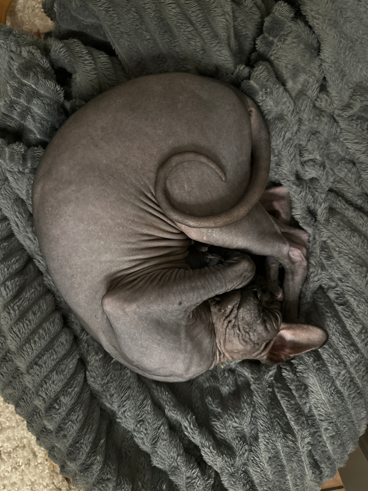 A hairless cat, likely a Sphynx, is curled up asleep on a gray, plush blanket. The cat's body is a gray color, and its tail is curled around itself. The blanket has a textured, ridged pattern. The bac…read more