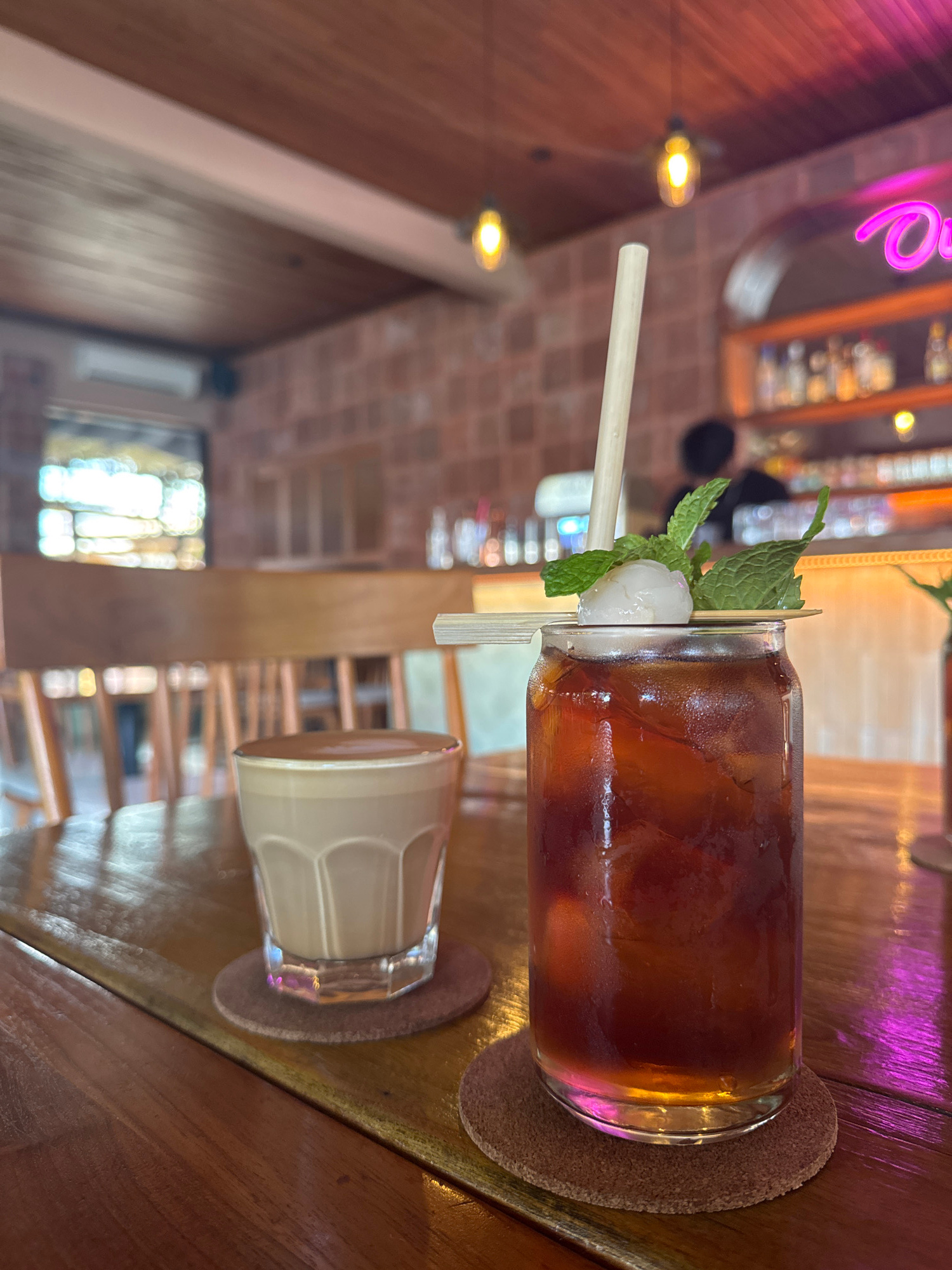 The image shows two beverages served in glasses on a wooden table. The first beverage is a dark liquid, possibly iced tea or coffee, garnished with mint leaves and a lychee. A natural straw is placed…read more
