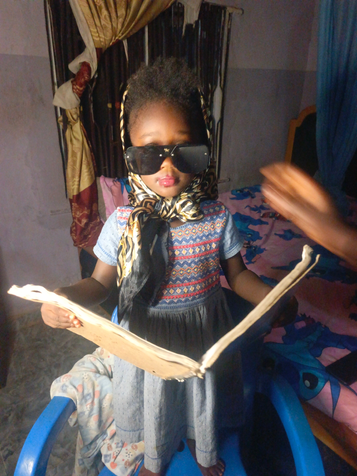 A young child stands on a blue plastic chair in what appears to be an indoor setting in Akwanga, Nigeria. The child is wearing dark sunglasses and a patterned headscarf, and is holding open a book witβ¦read more