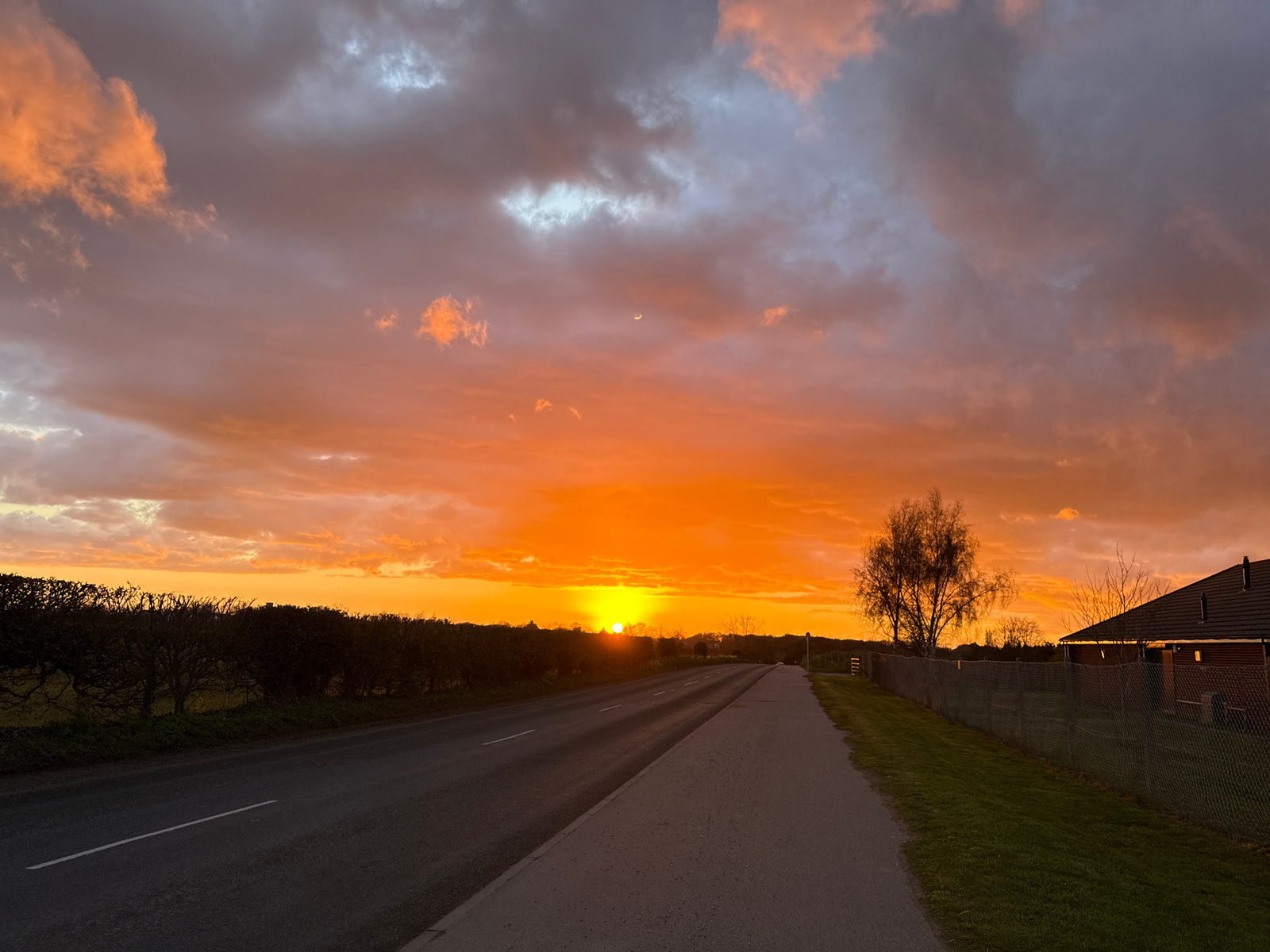 A landscape photograph shows a sunset in the sky over a road. The sky is filled with clouds, and the setting sun emits an orange glow. The road runs parallel to the image's lower edge and is flanked b…read more