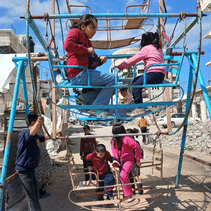 The image displays a group of children playing on a large, dilapidated, blue metal swing structure in an extensively damaged urban environment within Gaza City, Palestinian Territory. The swing appara…read more