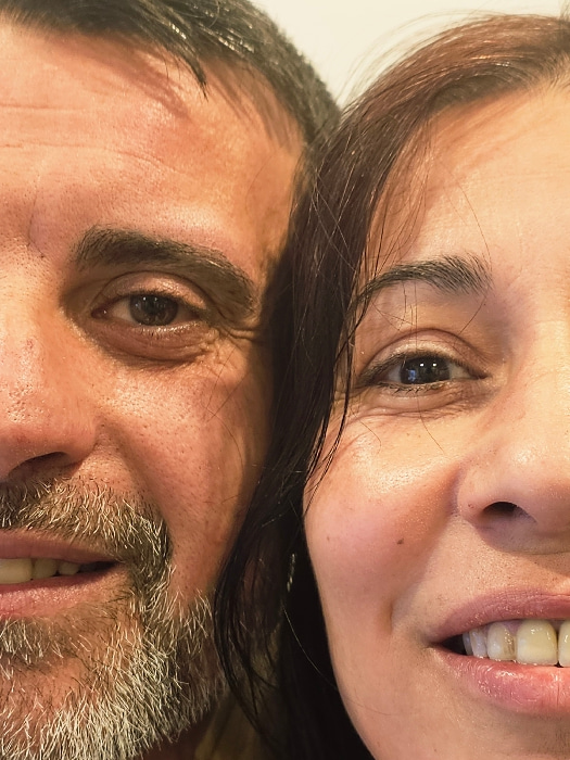 A selfie presents two individuals in close proximity, their faces touching. The person on top has dark hair, an eyebrow, and a partially visible eye, nose, and smiling mouth. The person below has dark…read more