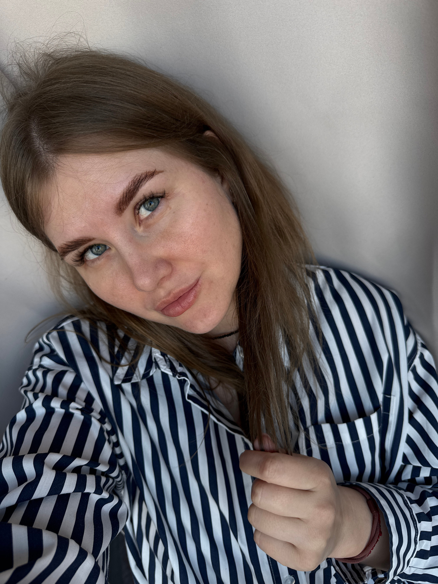 A young woman lies on a light-colored surface, likely a couch or bed, wearing a blue and white striped shirt. She is looking directly at the camera with a slight smile. Her hair is light brown and her…read more