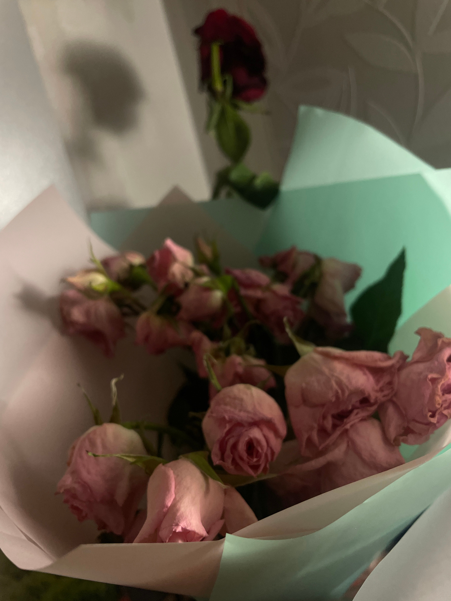 The image shows a bouquet of pink roses wrapped in light blue and white paper. The roses appear to be slightly wilted or dried. To the left of the bouquet, out of focus, is a single, dark red rose lyi…read more
