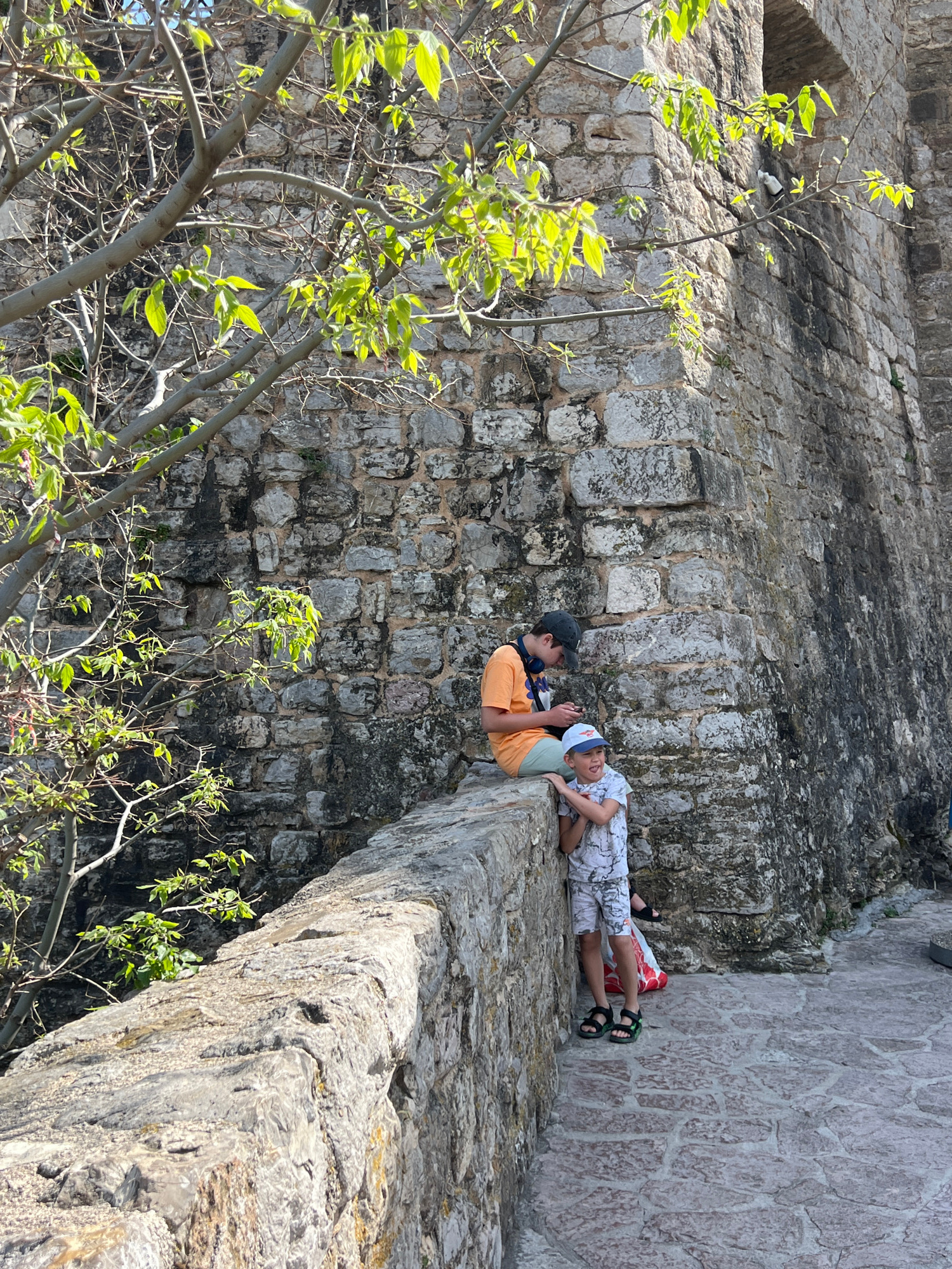 Two boys are seen resting on a narrow stone ledge alongside a tall, ancient-looking stone wall, likely part of a fortress or old town structure in Budva, Montenegro. The image is taken in bright dayliβ¦read more