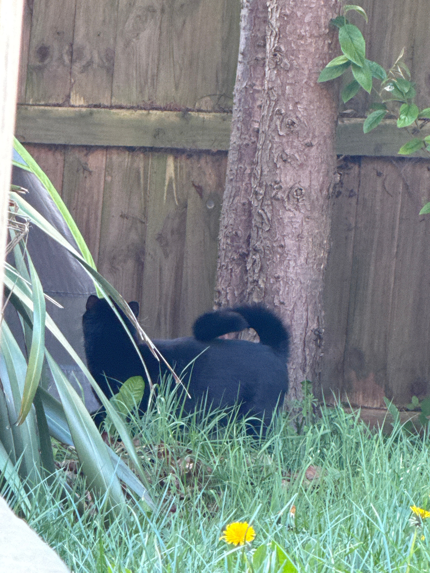 A black cat is near a wooden fence and some tall grass. The location is Desborough, United Kingdom.