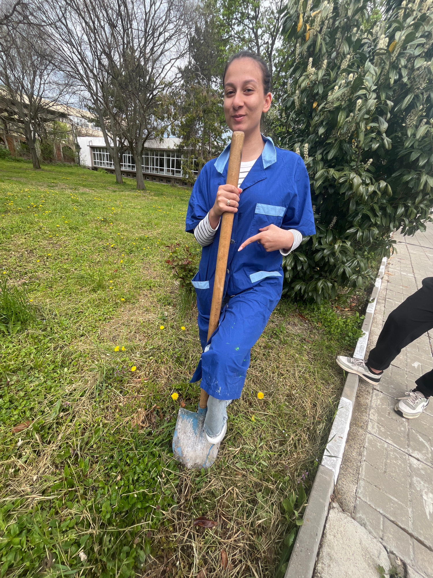 This image, captured in Karnobat, Bulgaria, features a young woman outdoors, holding a shovel. She is positioned on a grassy area, wearing blue overalls over a white and blue striped long-sleeved shir…read more