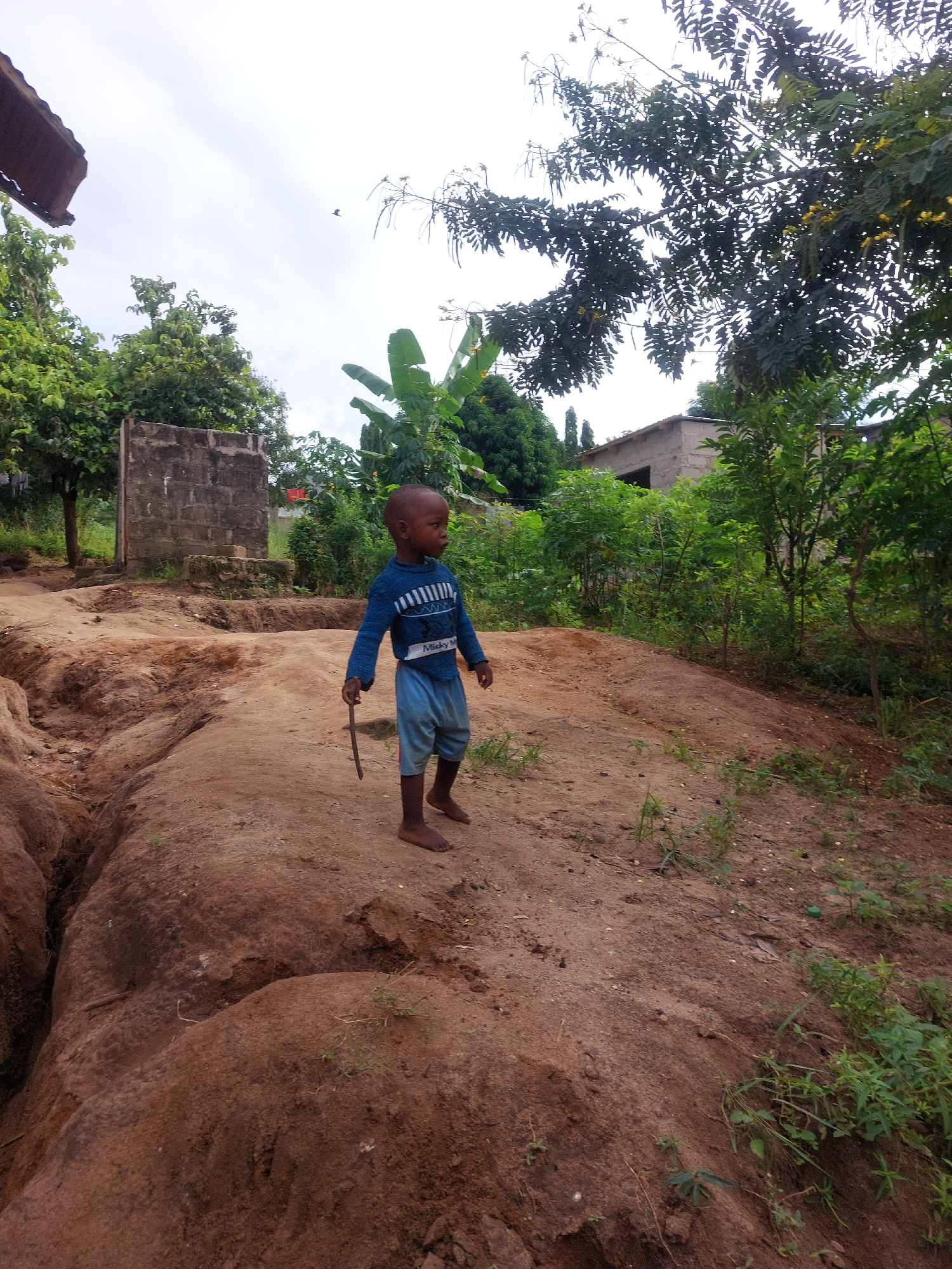 A young boy is standing on a large, reddish-brown rock or mound of earth. He is barefoot and wearing a blue long-sleeved shirt and blue shorts. He is holding a small stick in his right hand. The backg…read more