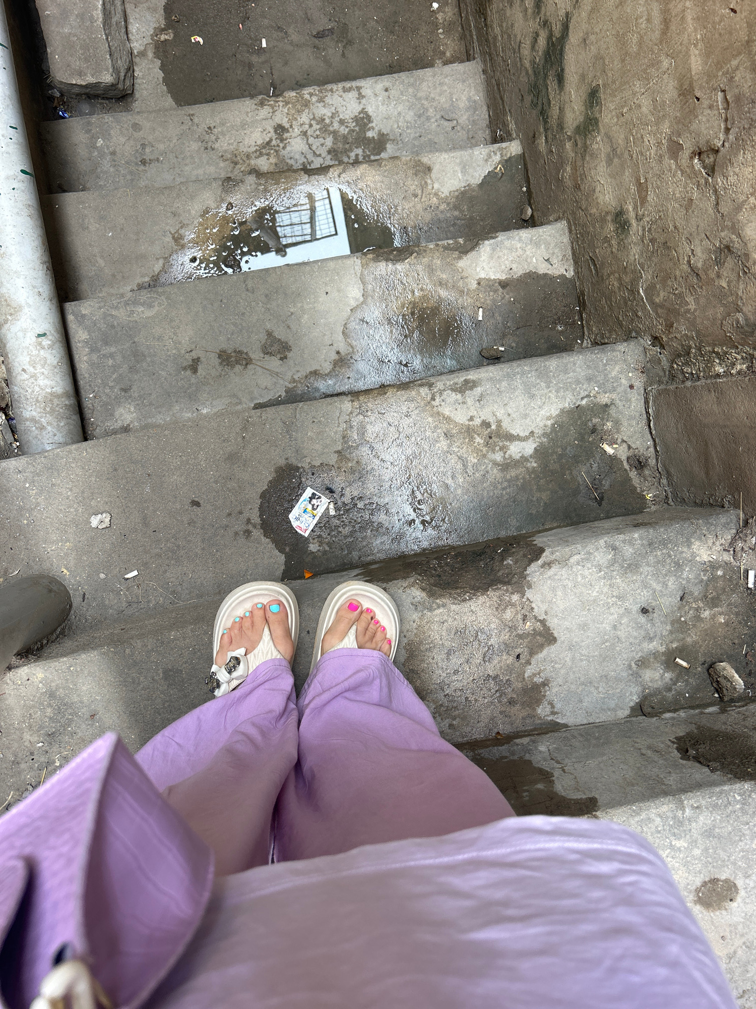 The image depicts a top-down view of a person standing on a concrete staircase in Puttaparthi, India. The staircase appears weathered and dirty, with water, litter, and debris scattered across the steβ¦read more