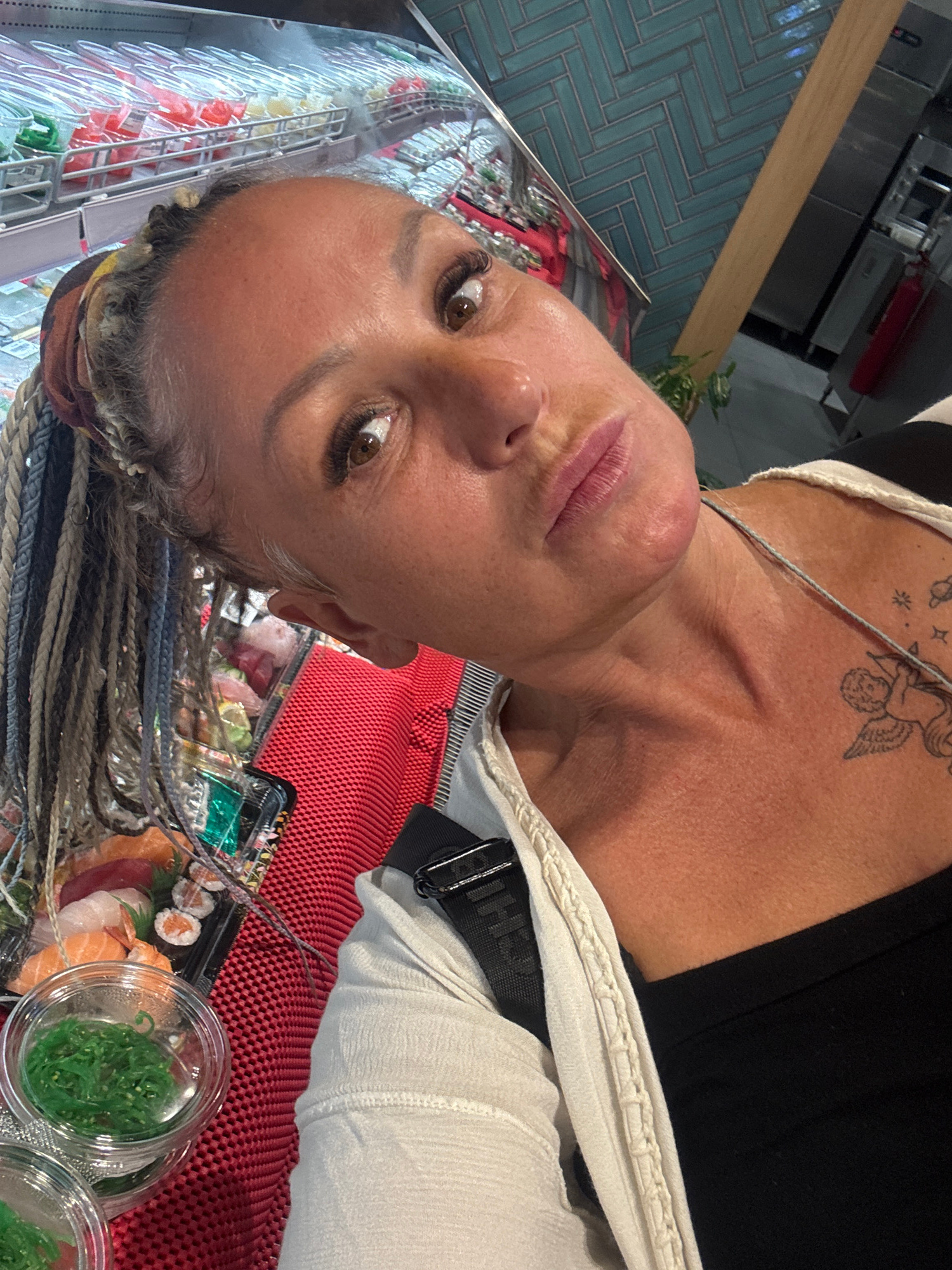 The image is a selfie of a woman in what appears to be a casual dining environment or a food establishment in Kuta Selatan, Indonesia. The woman, positioned prominently in the frame, has medium-tan sk…read more