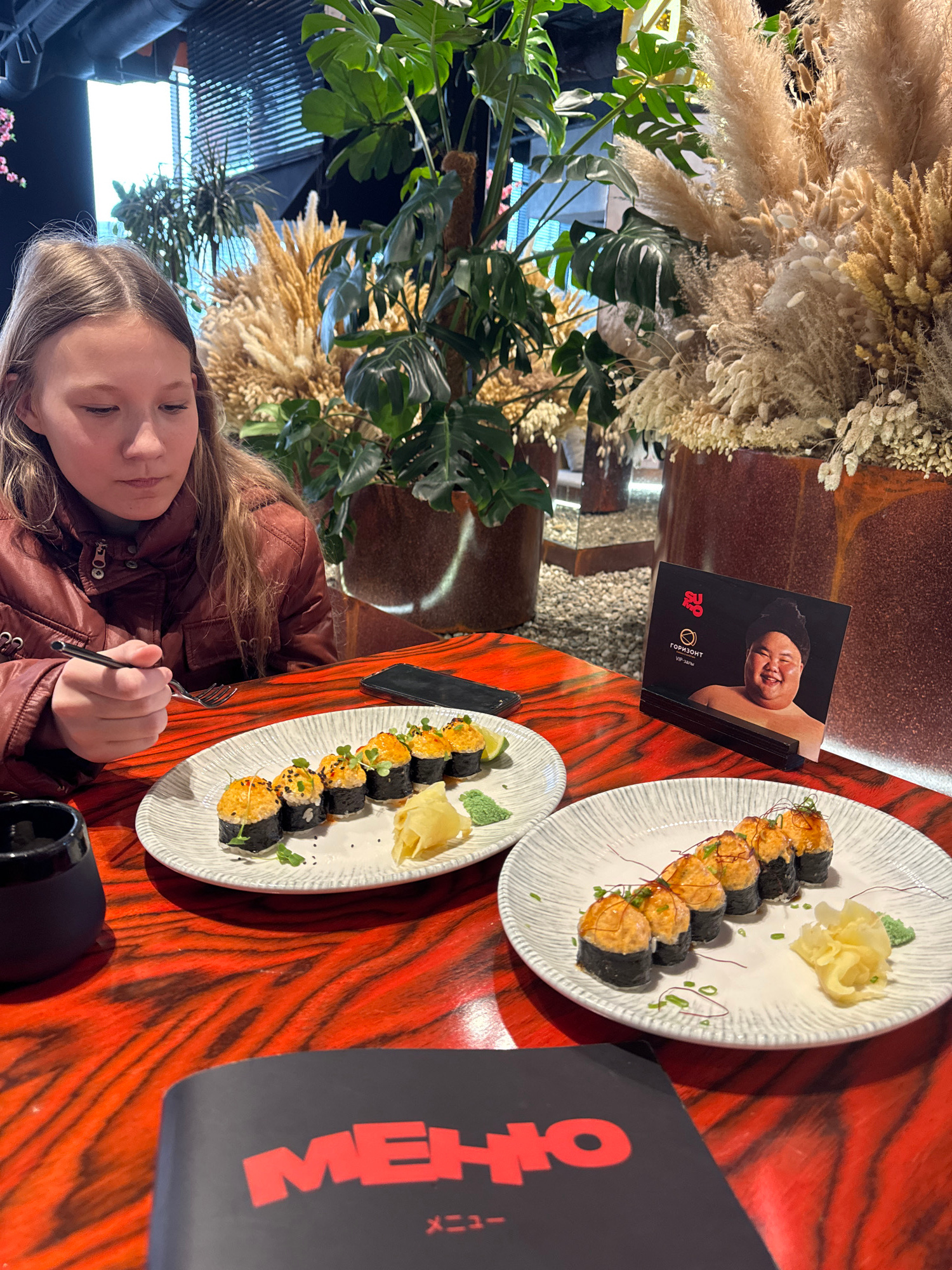 A young girl sits at a red-toned wooden table in a restaurant. She is wearing a brown leather jacket and holding a fork in her right hand. Two plates of sushi are visible on the table, each topped wit…read more