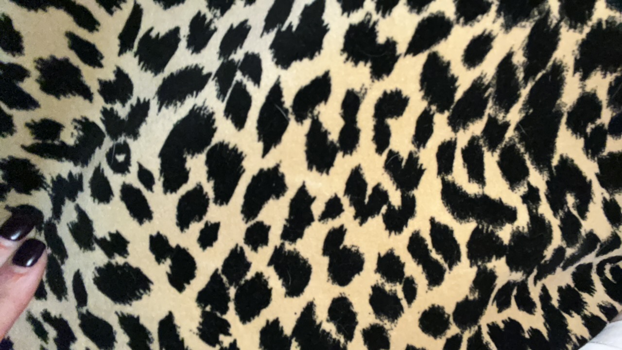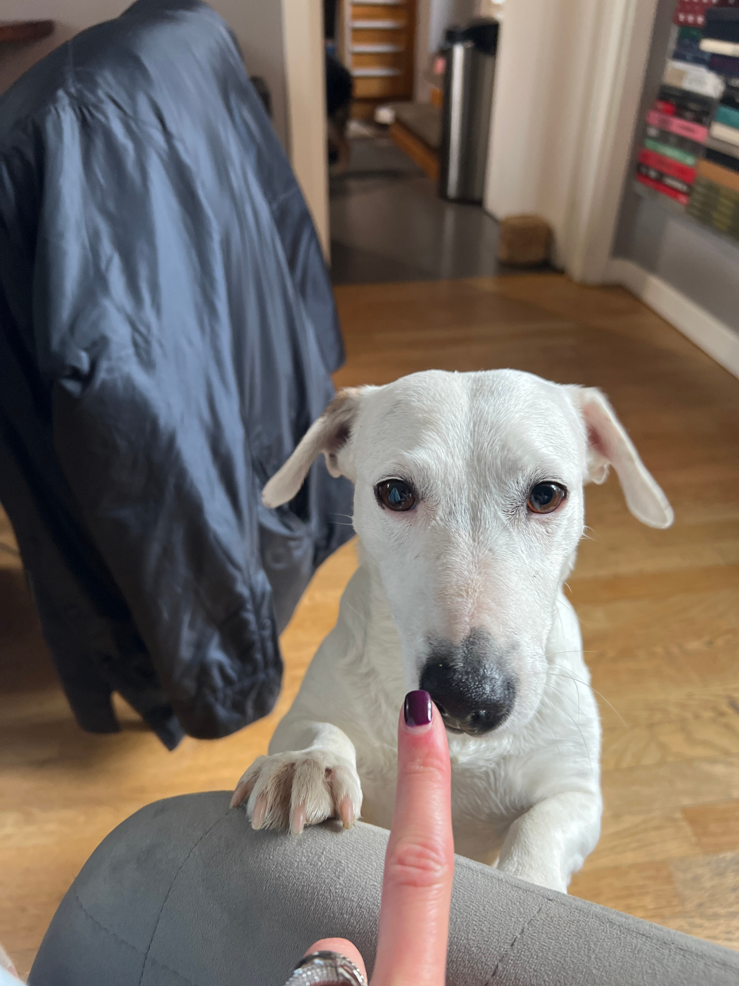 A medium, eye-level, indoor shot shows a predominantly white dog looking up at the camera, with a black coat and a portion of a gray chair in the background. The dog has brown eyes and a black nose. A…read more