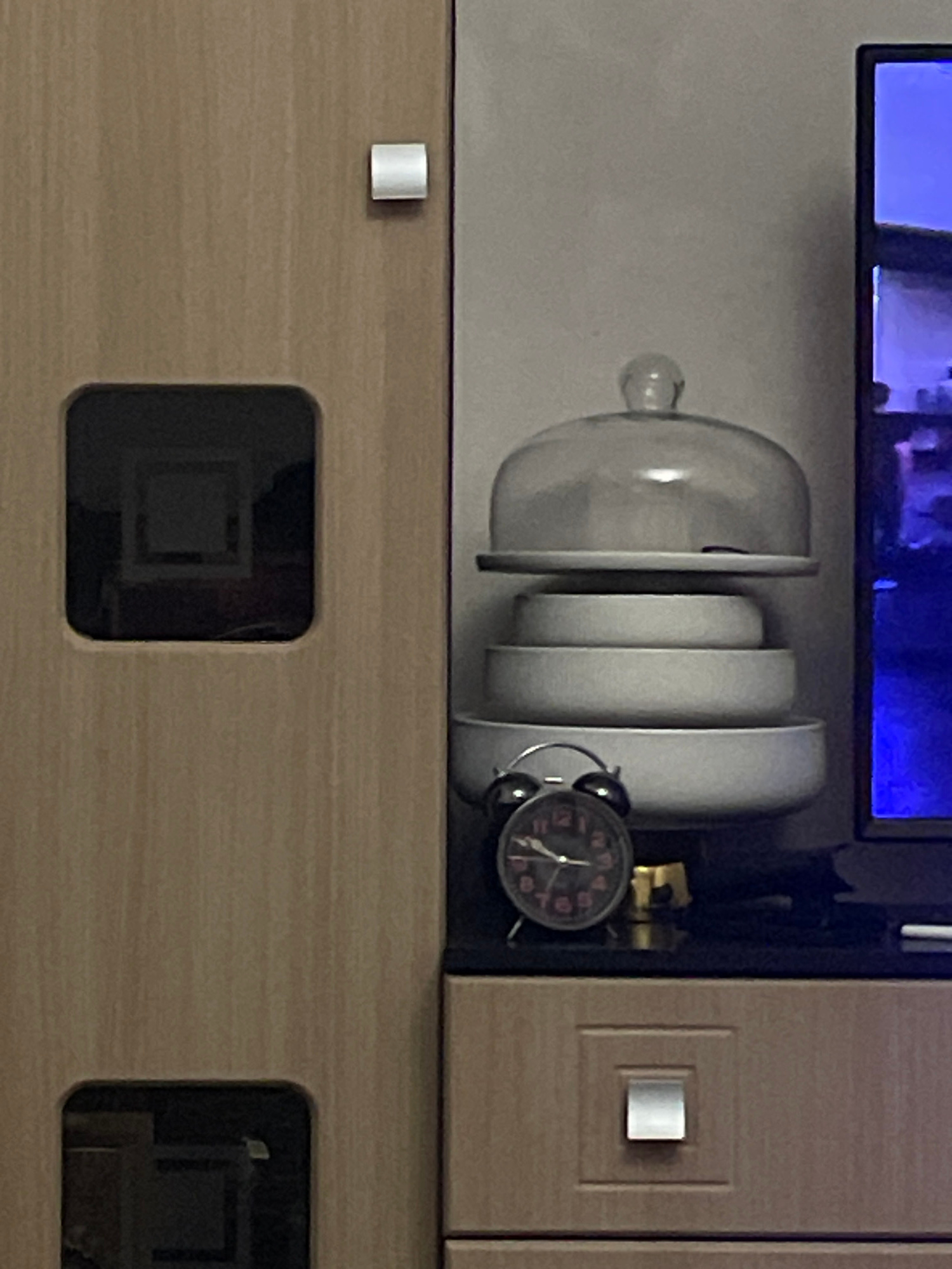 The image shows a shelf or cabinet with a television screen above it. On the shelf, there is a glass cloche covering several white plates. To the right of the plates is a small, round, black alarm clo…read more
