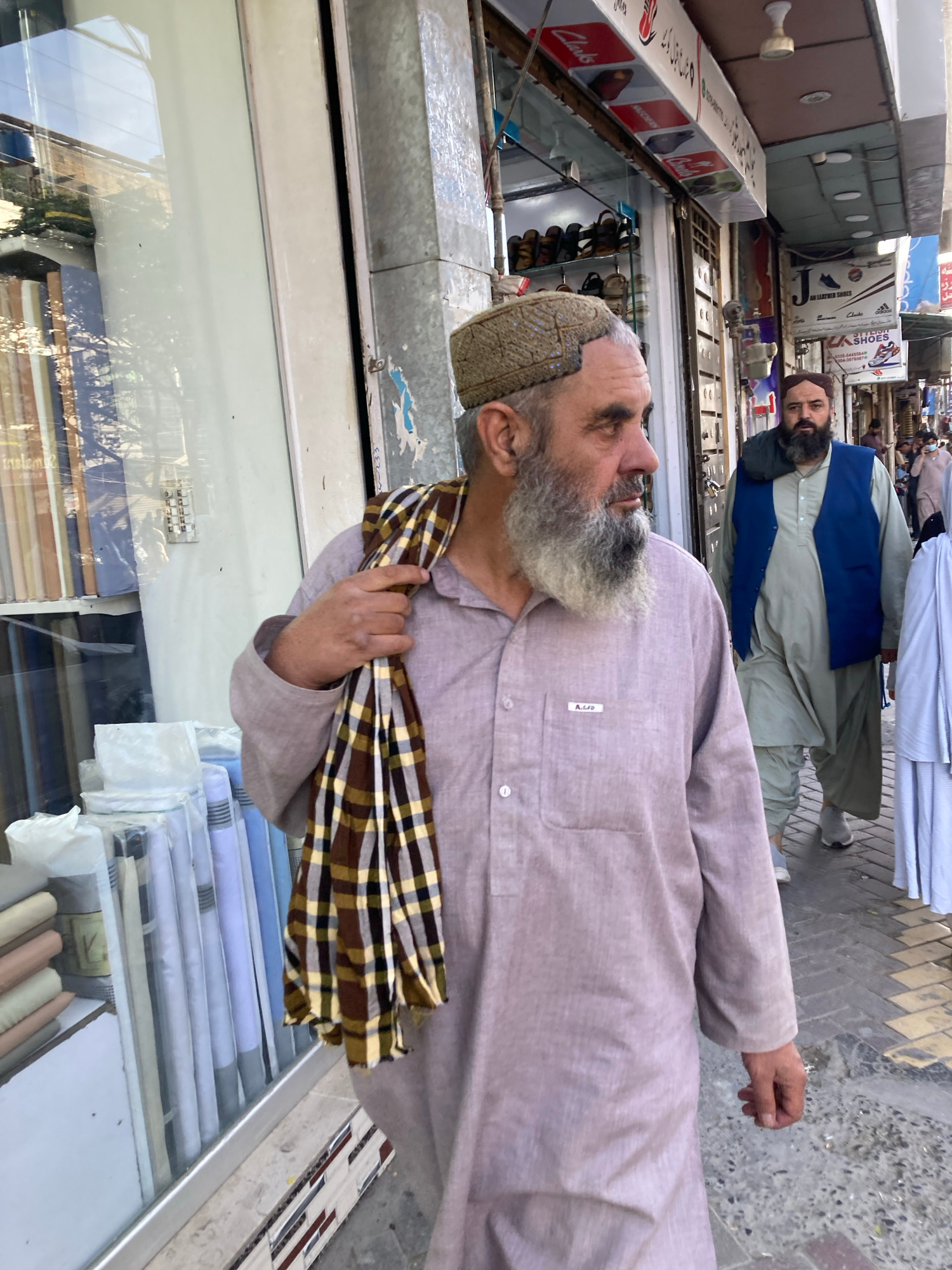 A medium, eye-level shot depicts a man in Quetta City Tehsil, Pakistan. The man, who appears to be of middle-eastern or central-Asian descent, has gray hair and a gray beard. He wears a gray-brown hat…read more