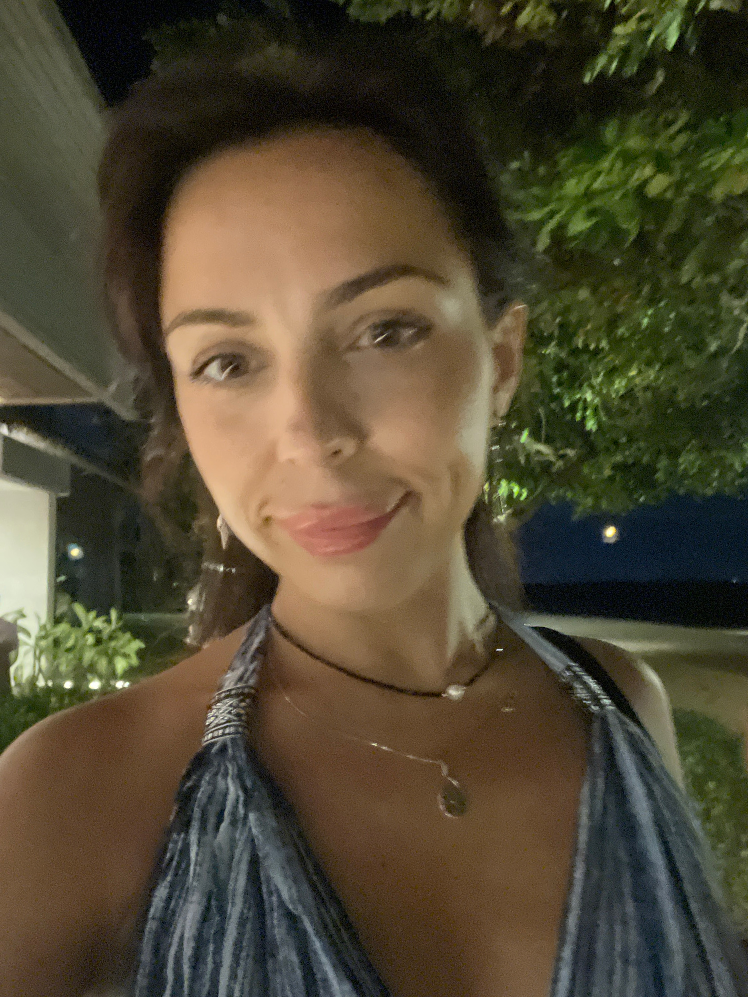 A medium shot depicts a woman outdoors in Unknown, Indonesia. She has dark curly hair and brown eyes. The woman wears a black choker necklace and a silver chain necklace with a pendant. Her dress is p…read more