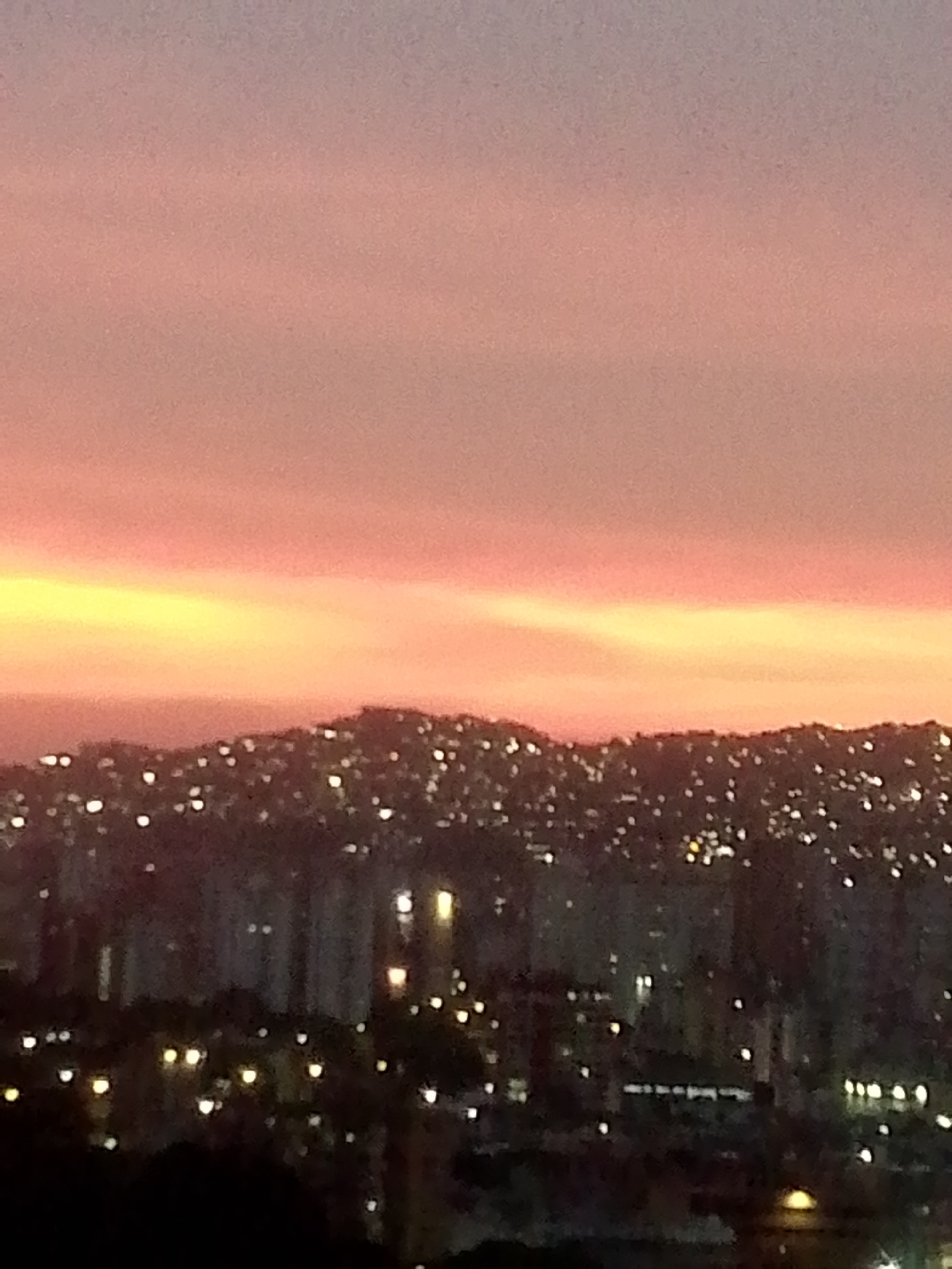 The image captures a cityscape under a sunset sky. The sky exhibits a gradient of colors, from pink at the top to orange near the horizon. Below the horizon is a dark landscape dotted with numerous sm…read more