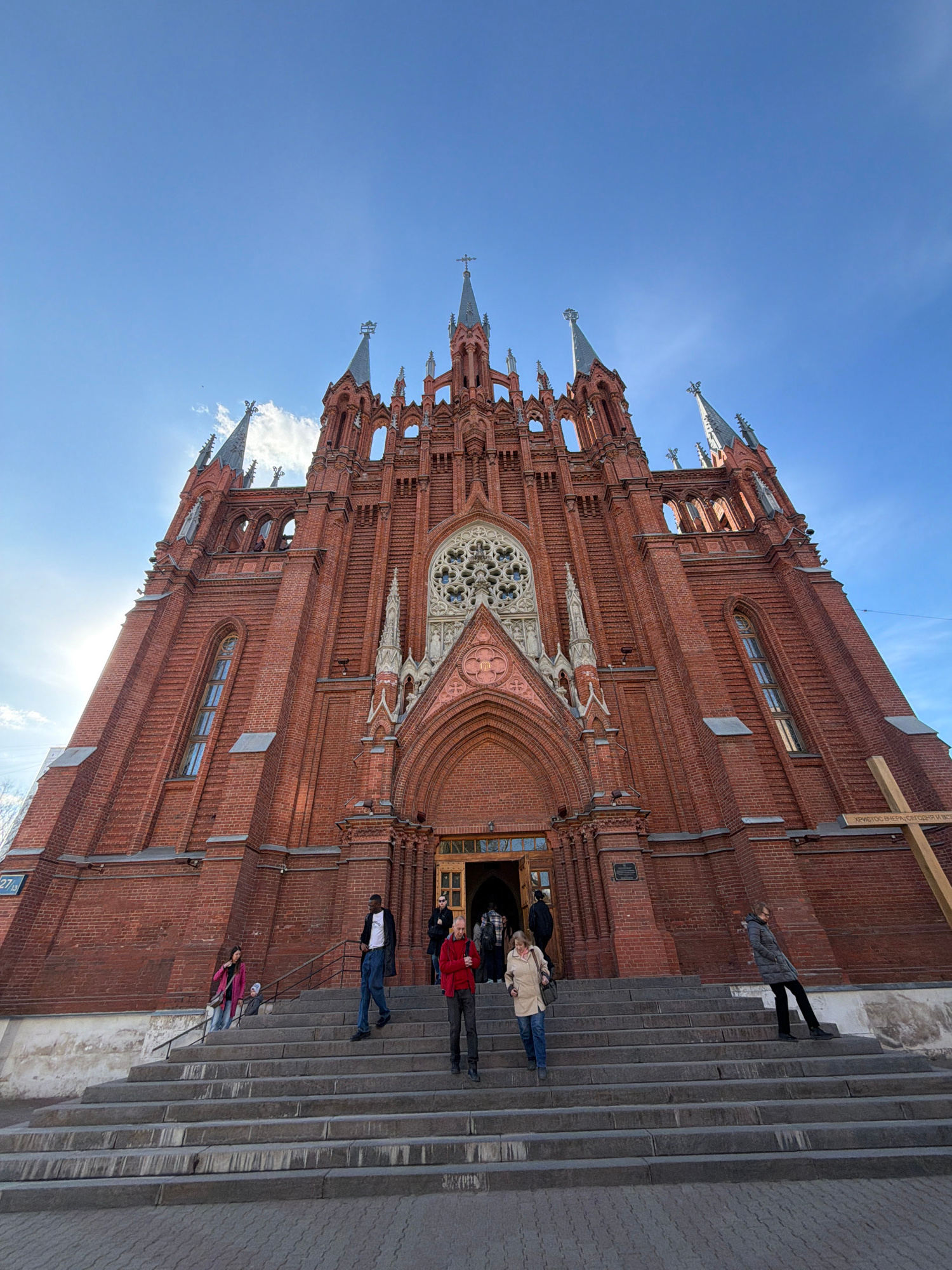 A low-angle, outdoor shot of a red brick cathedral, likely in Moscow, Russia, given its architectural style. The building's facade features a large rose window, pointed arches, and several spires reac…read more