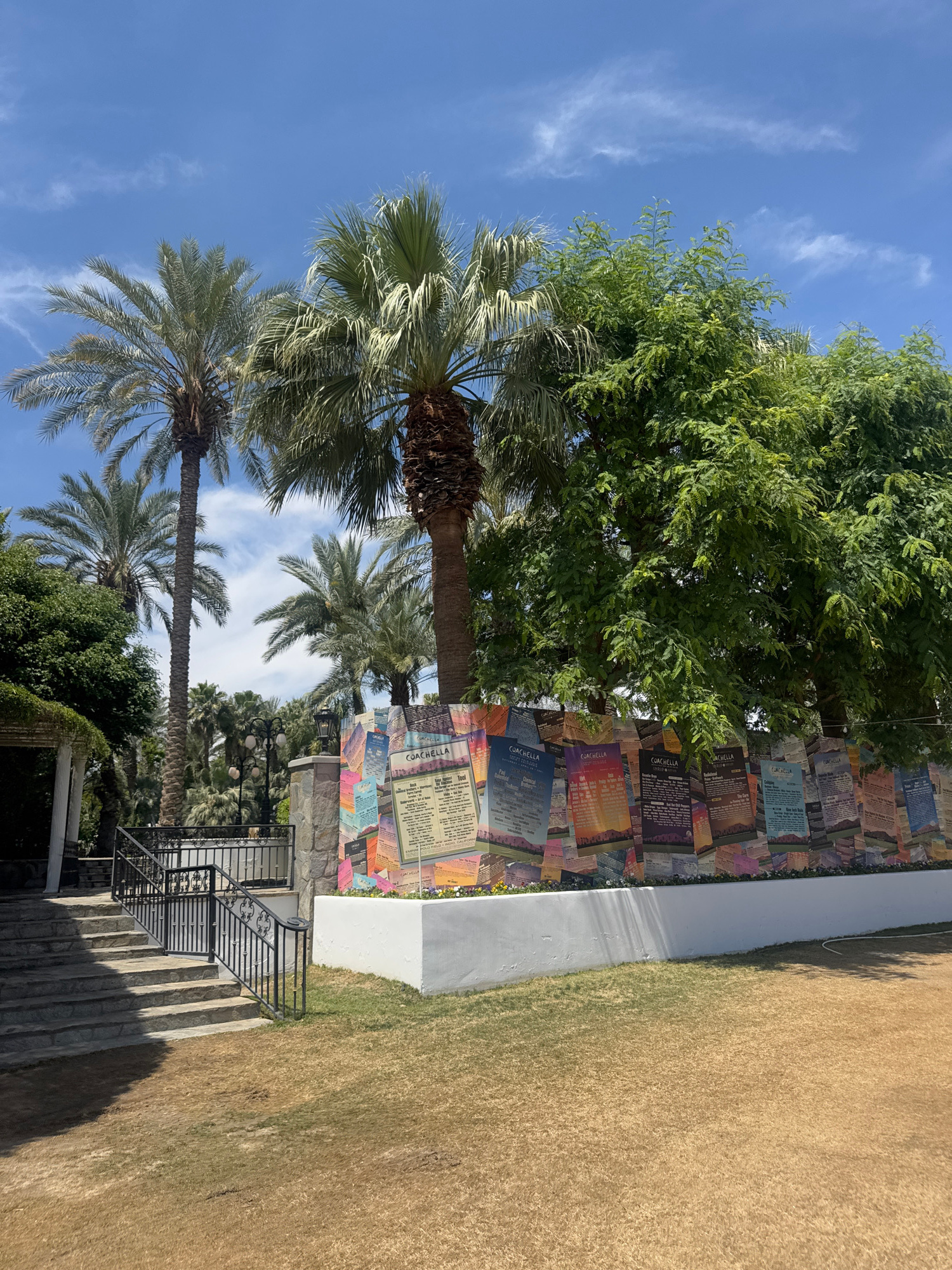 The image depicts a scene at the Coachella Music and Arts Festival grounds in Indio, California, USA. It is a sunny day with a few scattered clouds in the blue sky. In the foreground, there are severaβ¦read more