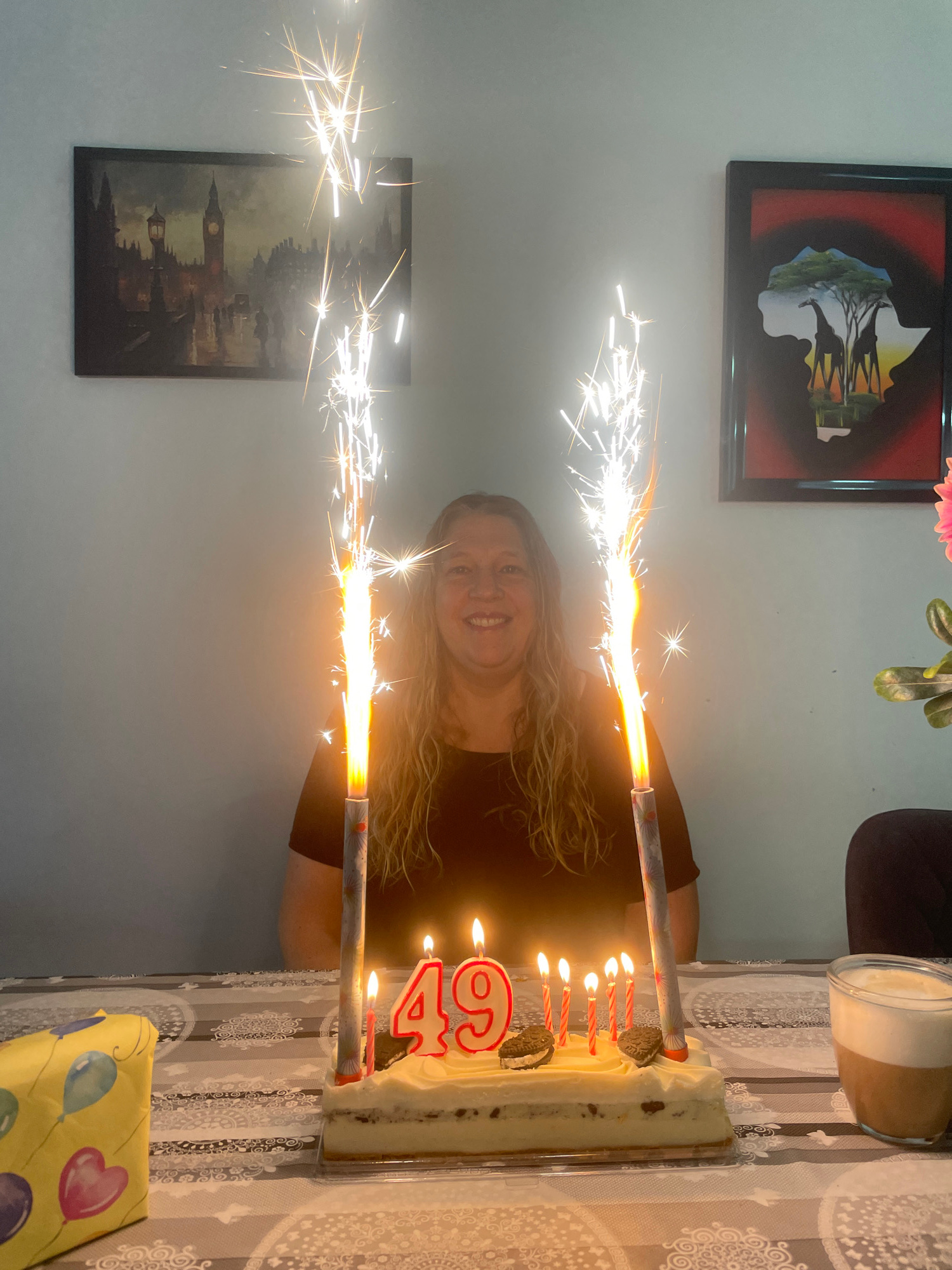 This image depicts an indoor birthday celebration taking place in Raanana, Israel. A smiling adult female with blonde, wavy hair and wearing a dark top is seated behind a table, looking directly at th…read more