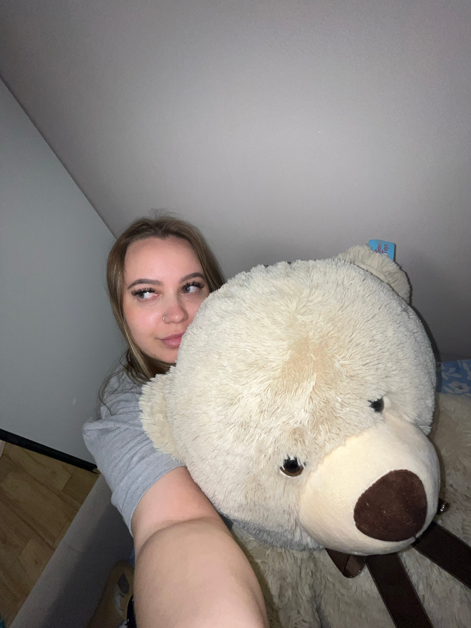 A young woman with light brown hair is posing for a selfie with a large, white teddy bear. The bear's nose is a darker brown color. The woman is wearing a gray shirt and has a nose ring. The backgroun…read more