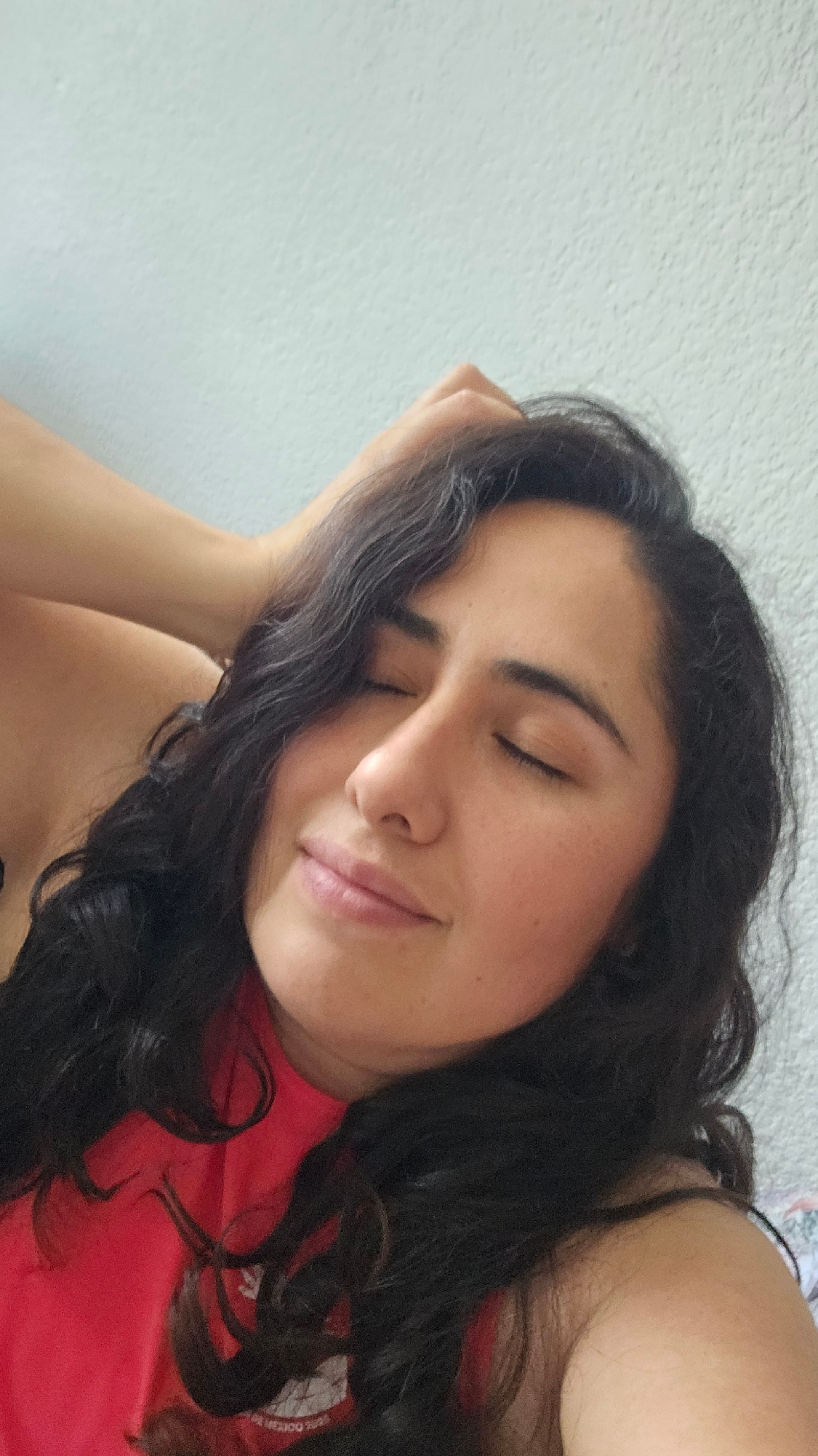 A woman with dark, wavy hair and closed eyes is lying down. She is wearing a red shirt. Her skin appears fair with some freckles. Her right arm is raised near her head, which rests on a surface or obj…read more