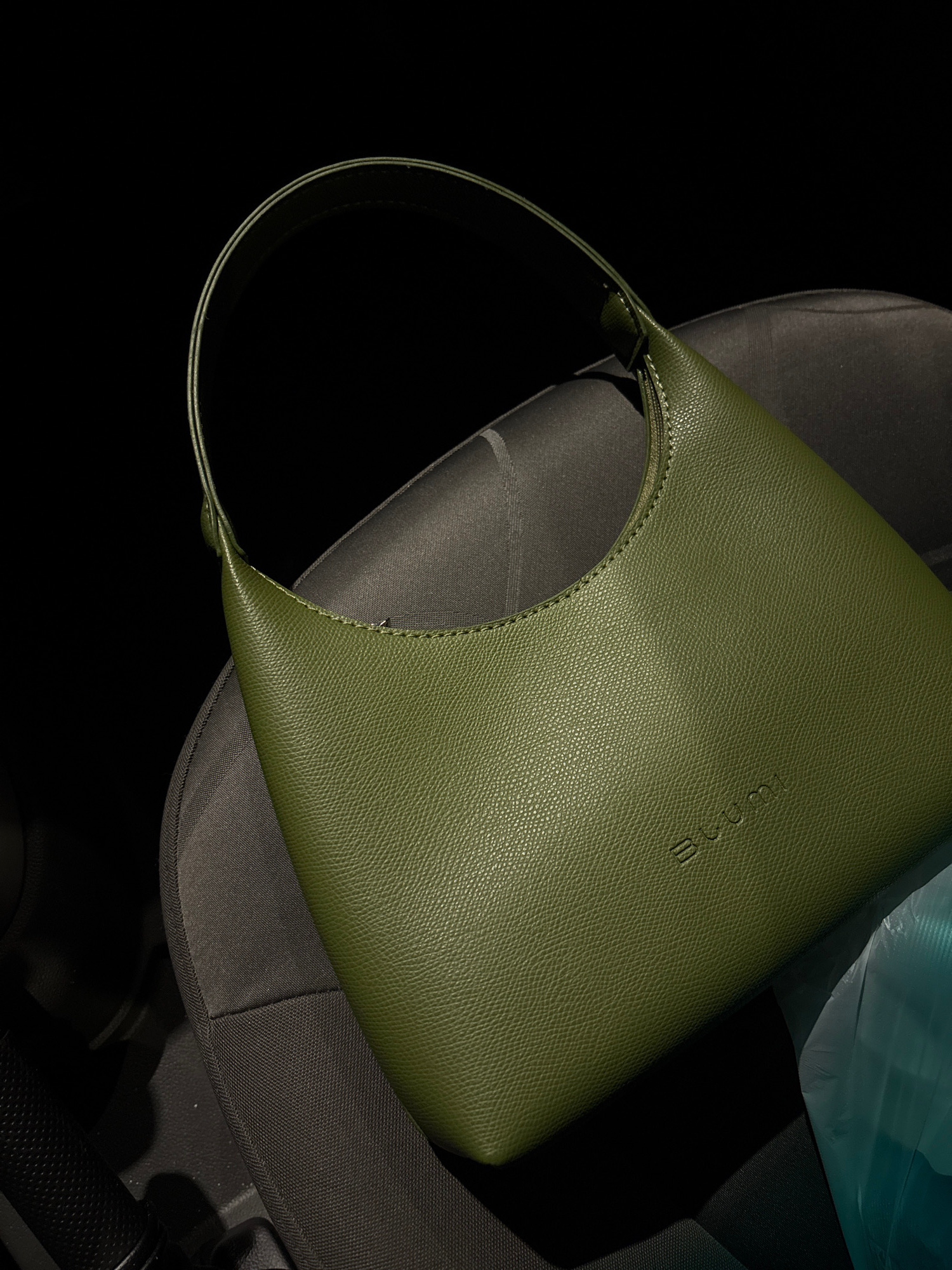 The image presents a close-up, top-down view of an olive green handbag resting on a dark gray fabric car seat. The handbag has a distinct crescent or half-moon shape, crafted from textured faux leathe…read more