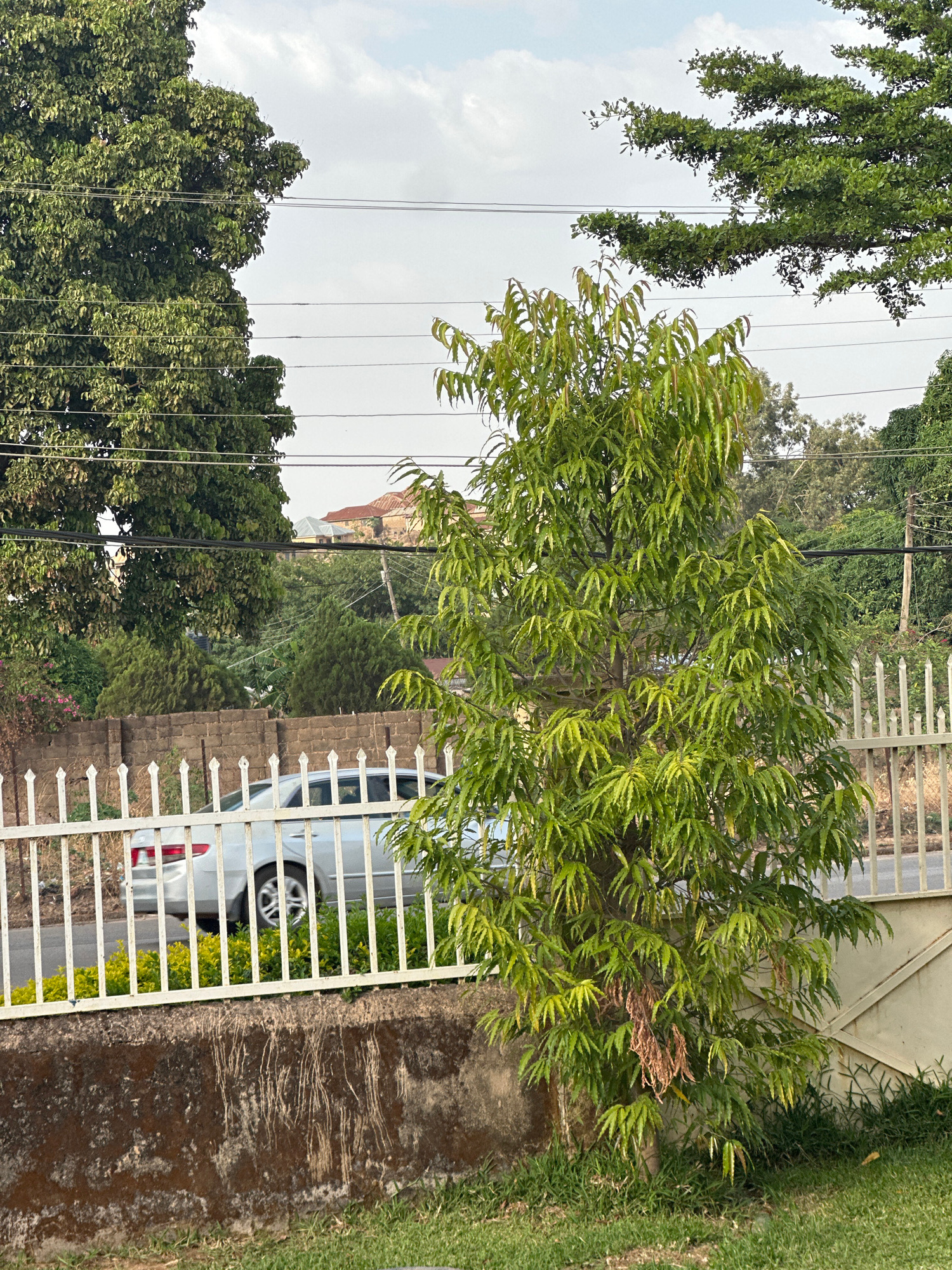 The image depicts a street scene in Jos, Nigeria. In the foreground, a tree with dense green foliage stands behind a white metal fence. A light-colored vehicle is partially visible through the fence,…read more