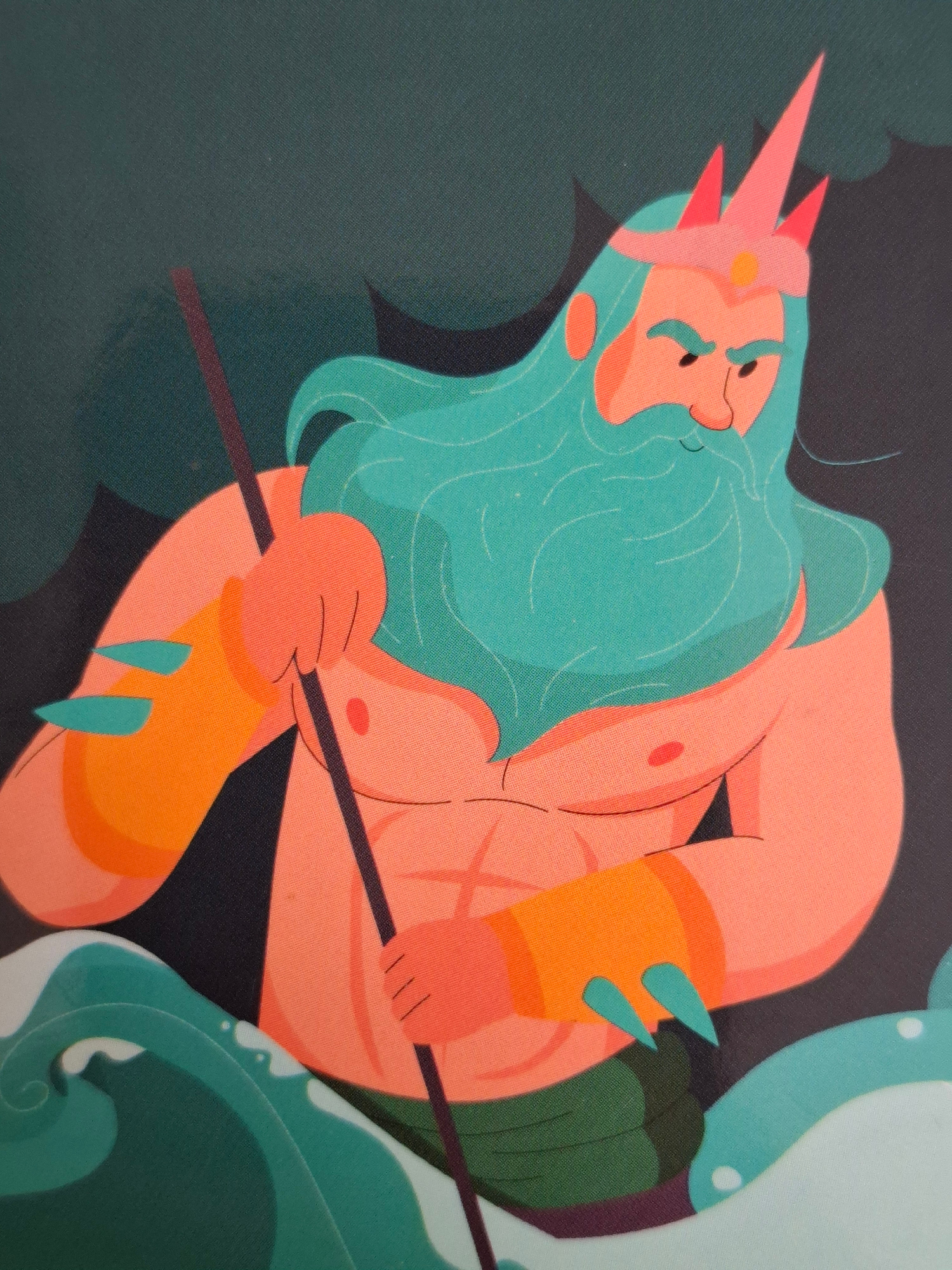 The image shows an illustration of a stylized, peach-skinned man with a teal-colored beard and hair. He wears a crown-like headpiece with pink horn-like projections. He is holding a brown spear or sta…read more