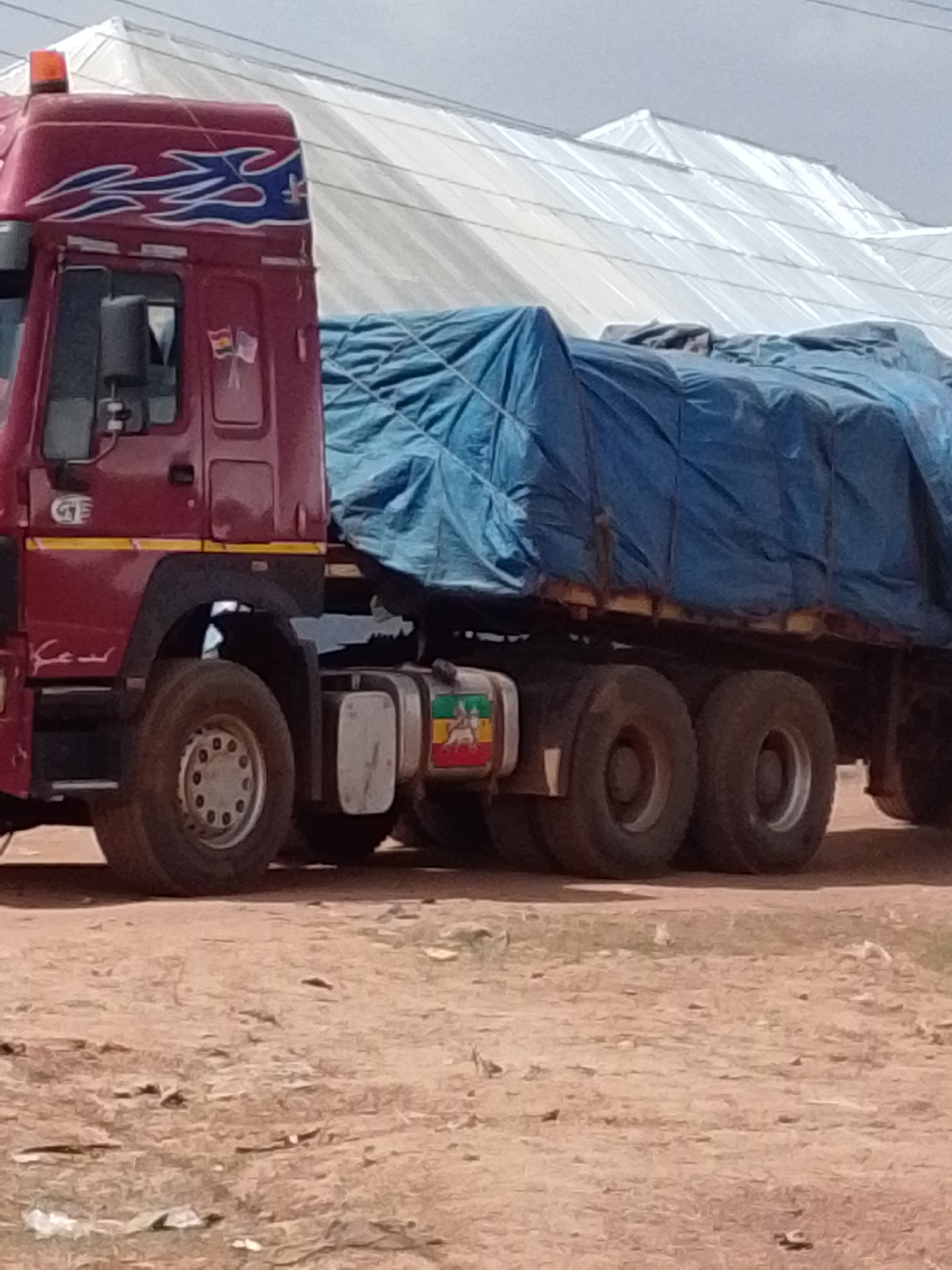 A burgundy tractor-trailer is parked on a dirt surface. The trailer is covered with a blue tarp. The tractor has a decorative blue and white design on the top, as well as flags on the door. The locati…read more