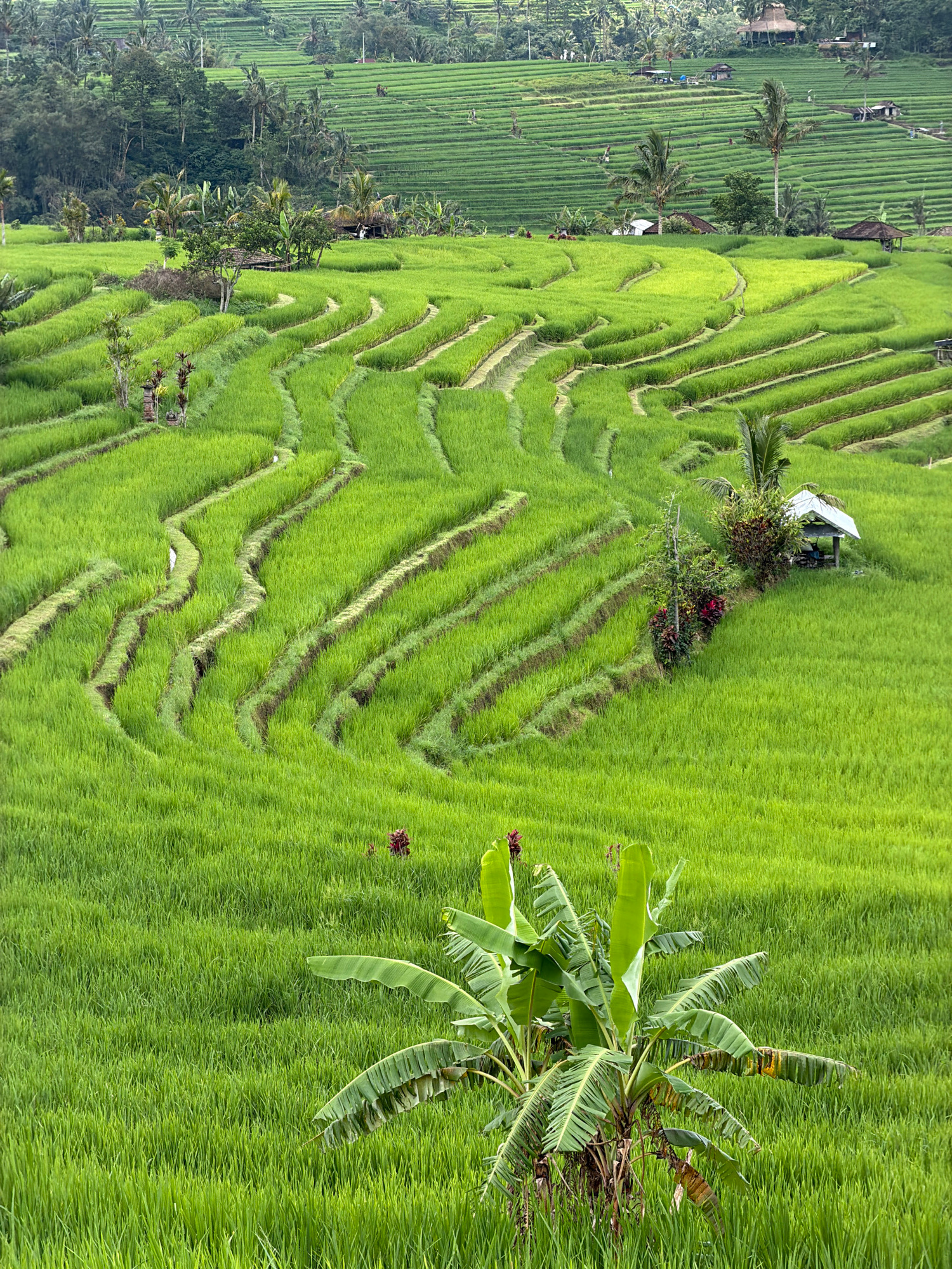 The image shows a terraced rice paddy field in an unknown location in Indonesia. The rice terraces are vibrant green, creating a stepped pattern across the landscape. A small structure, possibly a hut…read more