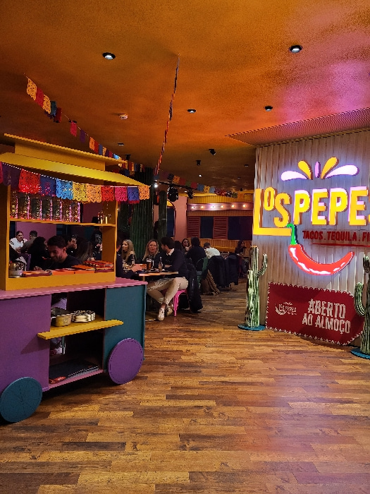 The image captures the vibrant interior of a Mexican-themed restaurant or bar. The scene is brightly lit with artificial lighting, creating a warm and inviting atmosphere. The floor is made of polish…read more