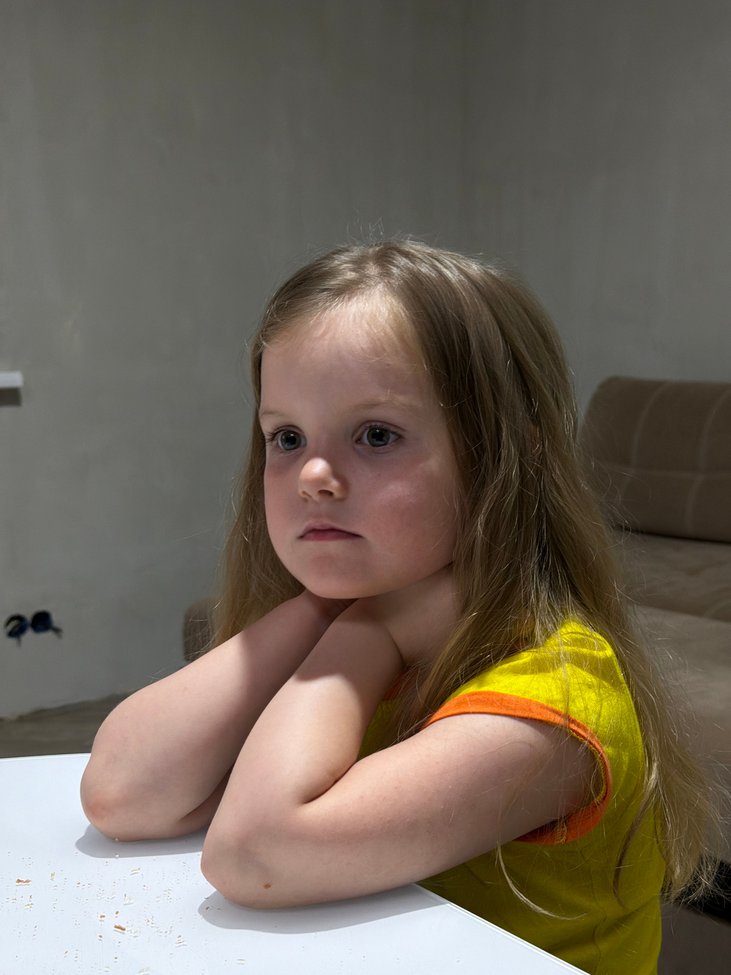 A young girl with long blonde hair is leaning on a white table. She is wearing a yellow t-shirt with orange trim. She rests her arms on the table, her hands clasped under her chin. The background show…read more