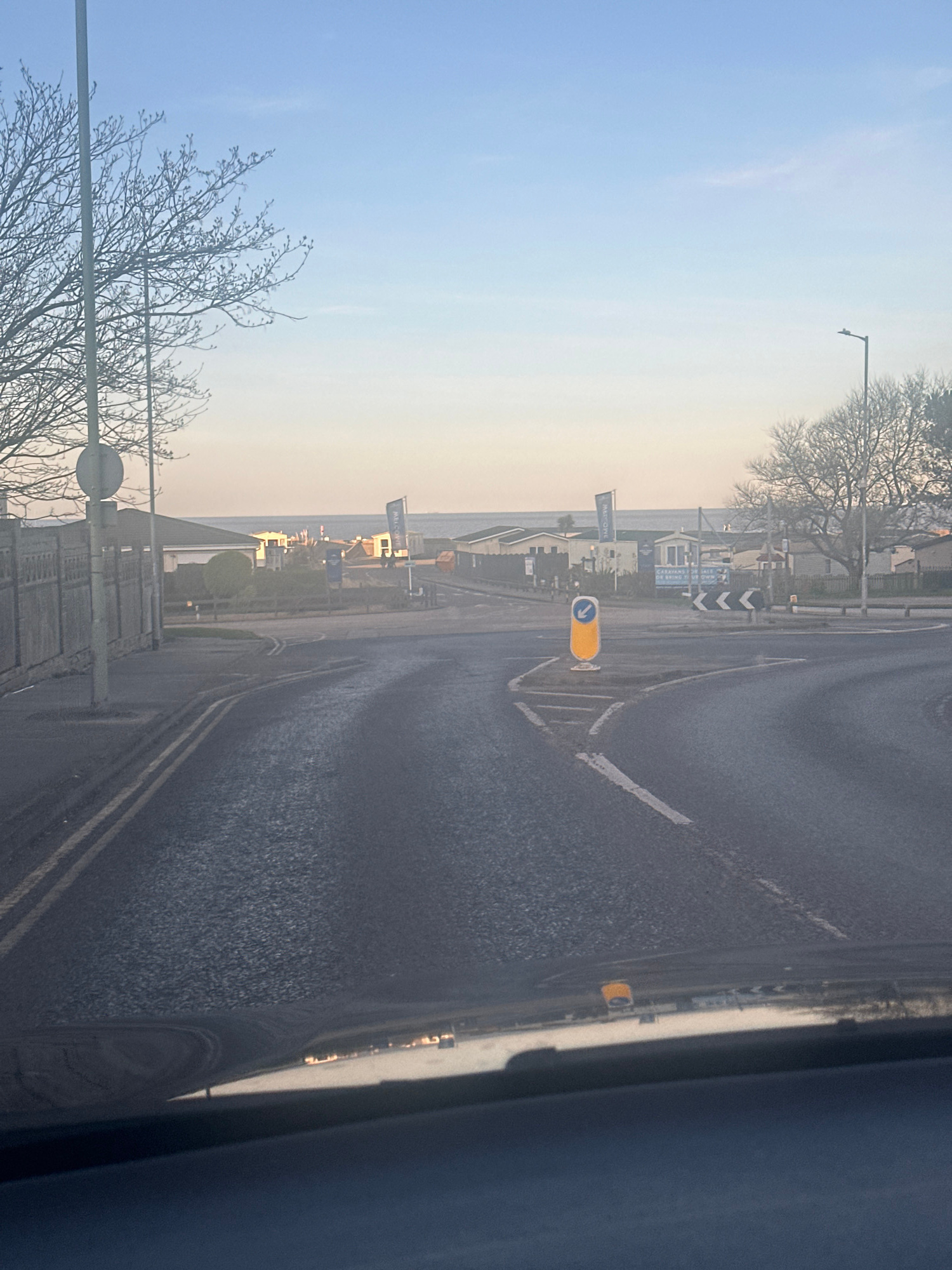 The image shows a view from a vehicle, looking out onto a road with double yellow lines. A yellow road marker with a blue arrow indicating a right turn is visible on the left side of the road. Further…read more