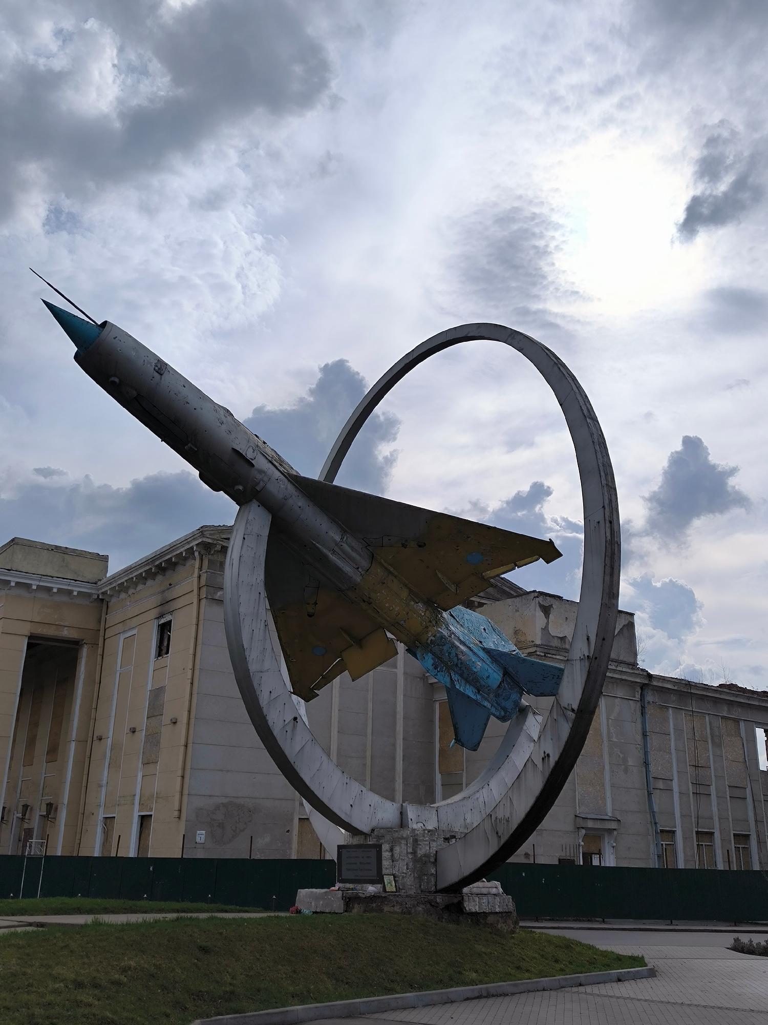 A low-angle, medium shot presents a MiG-21 fighter jet monument located in Vinnytsia, Ukraine. The aircraft, painted in muted grey, yellow, and blue tones, is mounted within a circular frame that bise…read more