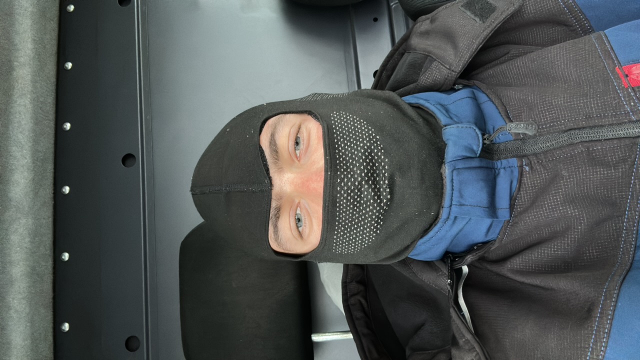 A person wearing a black balaclava with a white geometric pattern is visible. The person is wearing a black and blue jacket. The background is a dark gray surface with what appears to be rivets and ho…read more