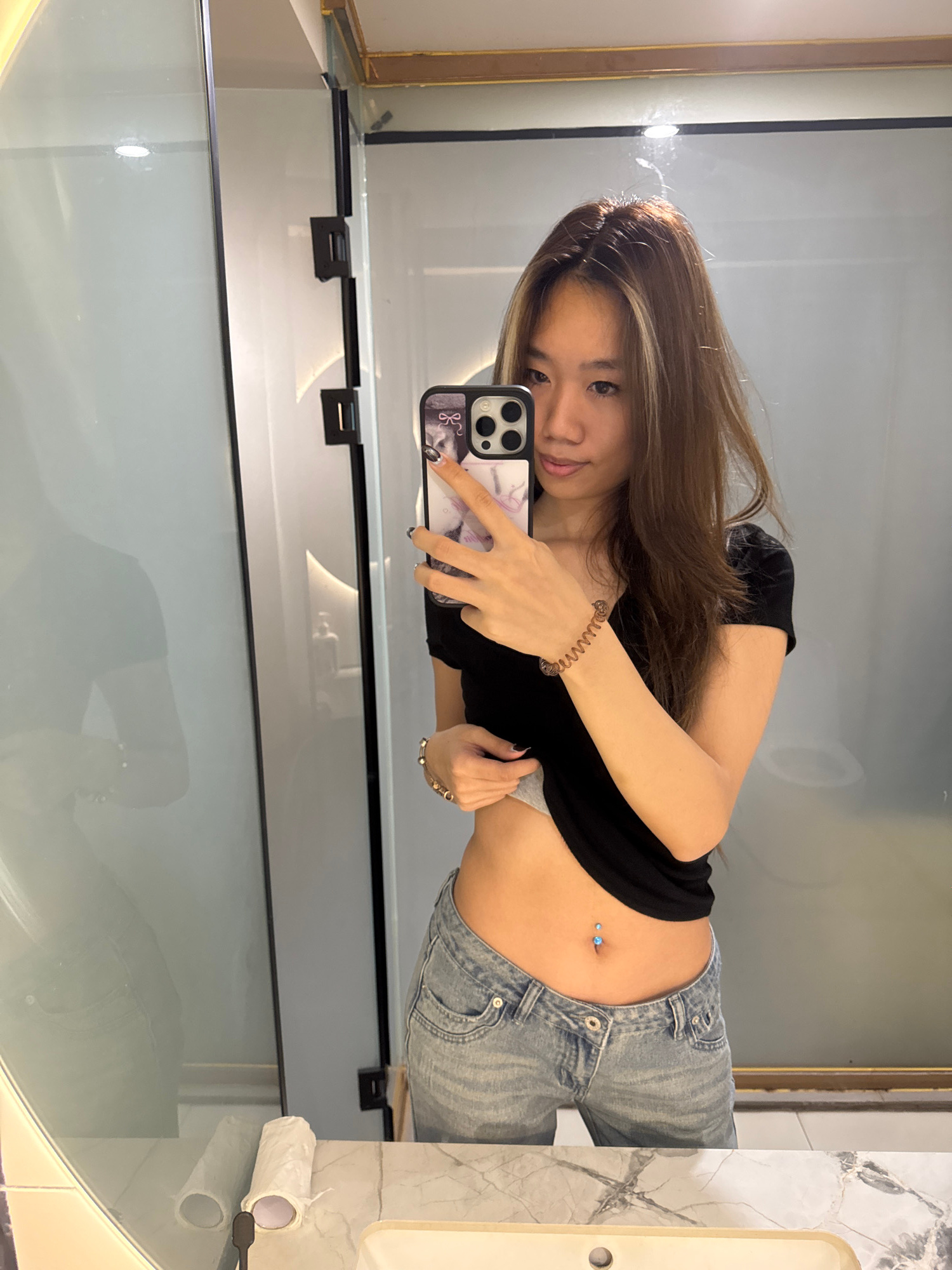 A young woman takes a selfie in a bathroom. She wears a black short-sleeved shirt and light blue jeans, with a belly button piercing visible. She holds a cell phone with a decorative case. The bathroo…read more