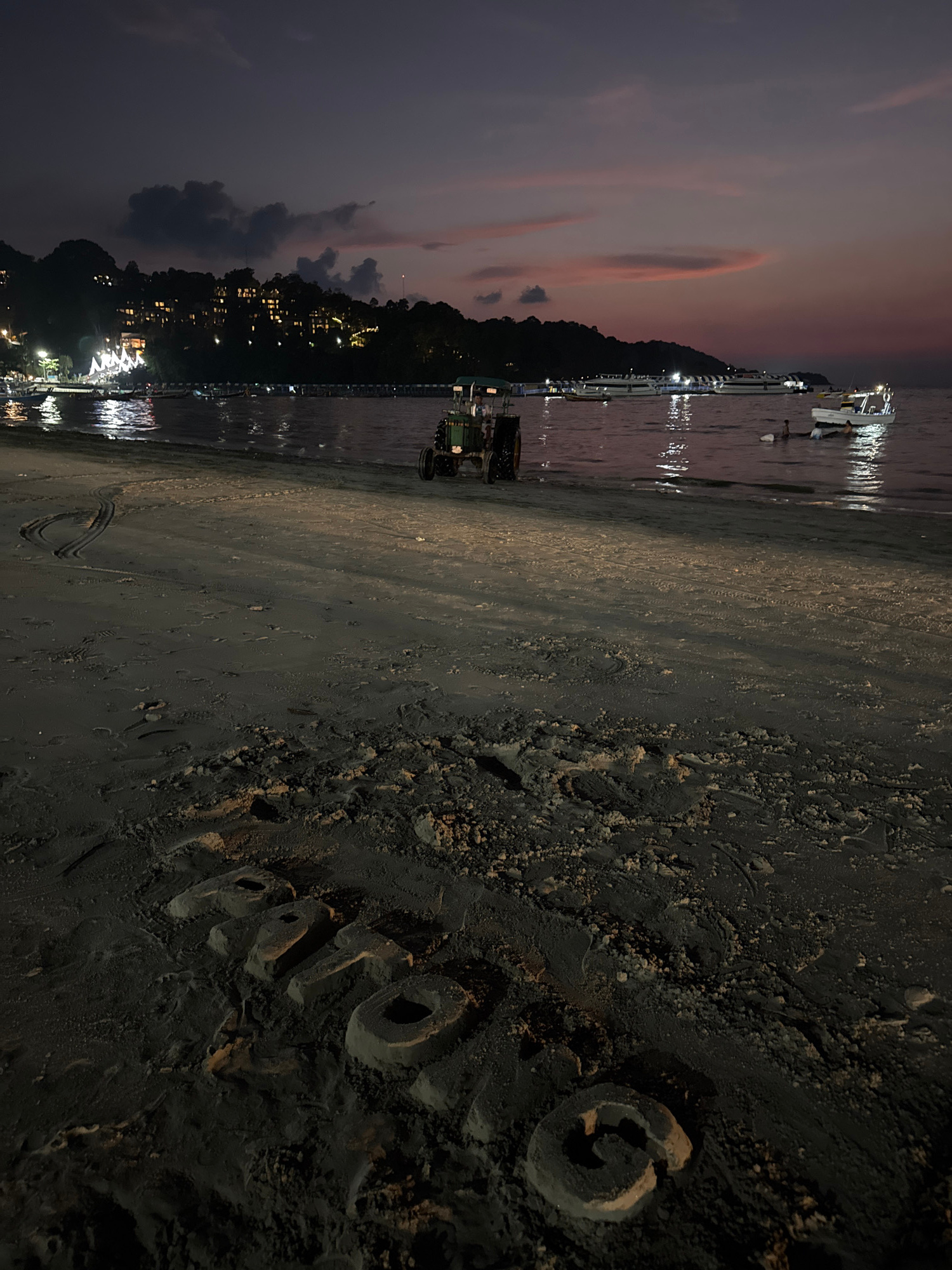 The image depicts a night scene at Patong Beach, Thailand. The foreground consists of dark, coarse sand with distinct tire tracks and imprints of the word "HELLO". The tide seems to be receding, leavi…read more