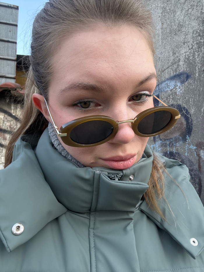 A female individual, appearing young adult, is depicted in a close-up, head-and-shoulders portrait in an outdoor urban setting. She has light skin, light brown hair pulled back, and green/hazel eyes.…read more
