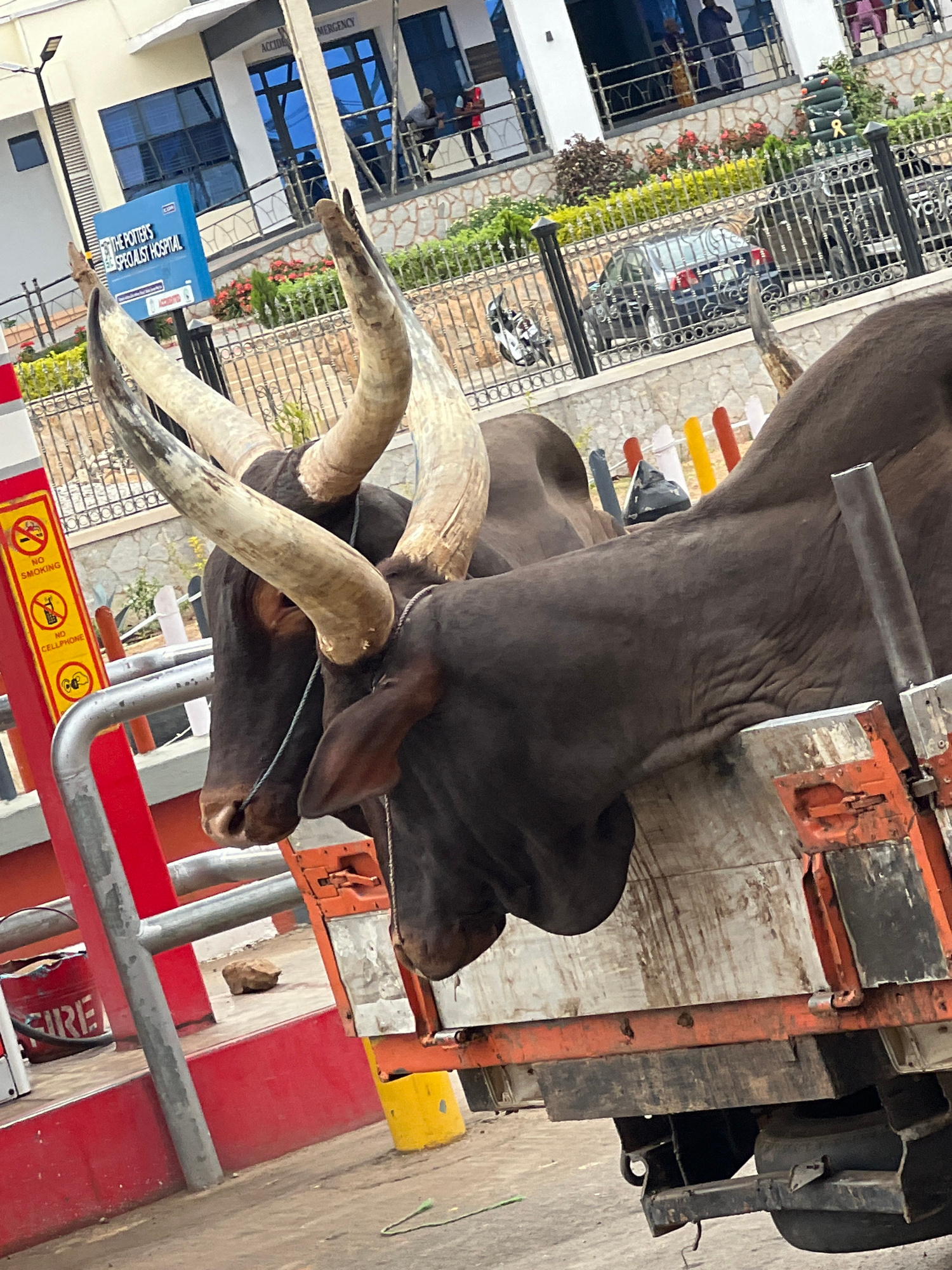 Two dark-skinned cattle with long, curved horns are being transported on the back of a vehicle. The cattle appear to be bound or tied together by rope or cord. The background includes buildings with bβ¦read more