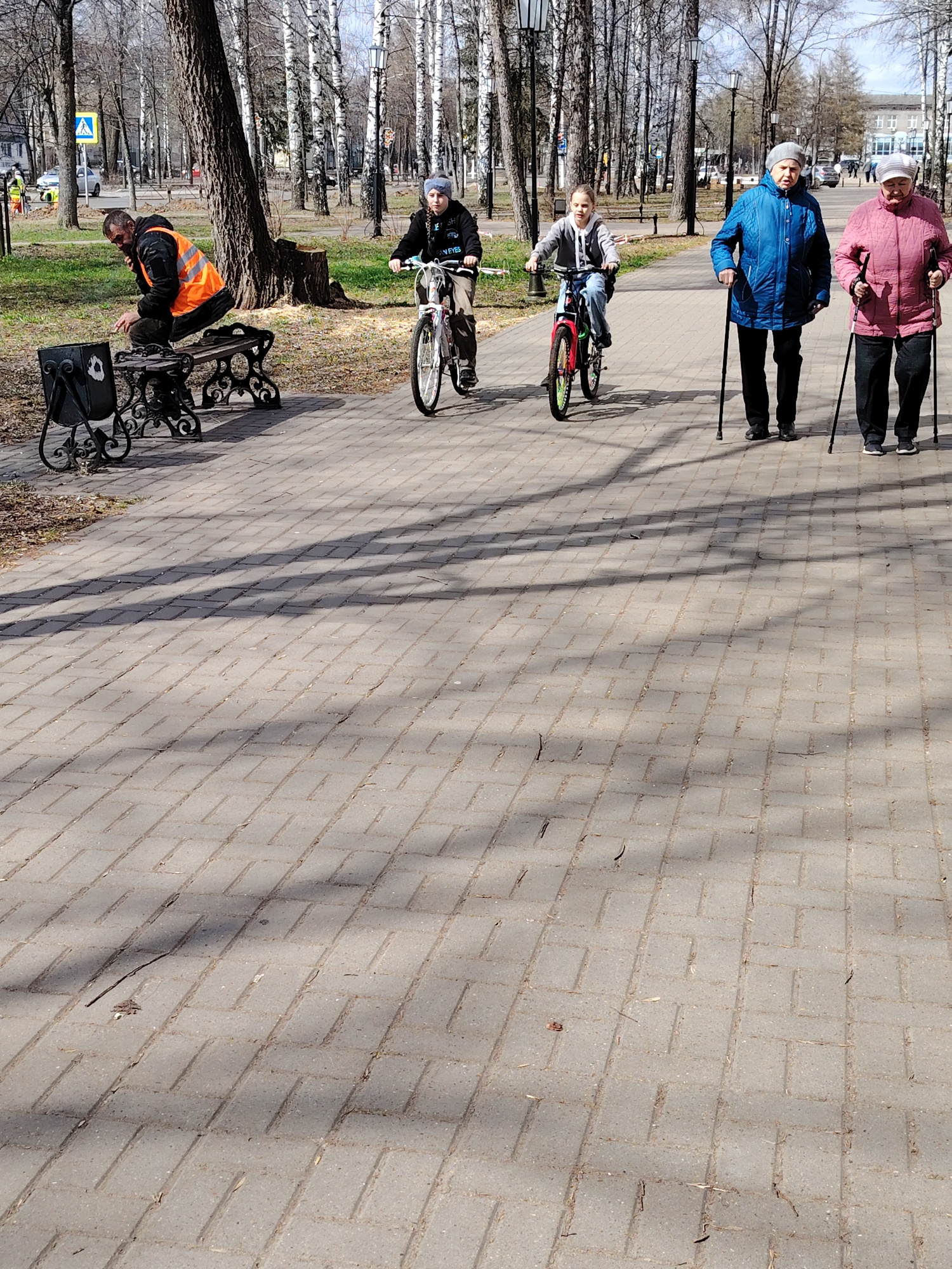 The image depicts a sunny day at an outdoor park in Chaikovsky, Russia. The ground is covered in interlocking paving stones, with tree shadows cast across it. On the left, a man wearing an orange safe…read more