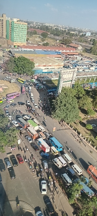An elevated, wide-angle daytime photograph captures a segment of Landhies Road and the surrounding urban environment in Nairobi, Kenya, specifically overlooking the Machakos Bus Station (Muthurwa Bus…read more