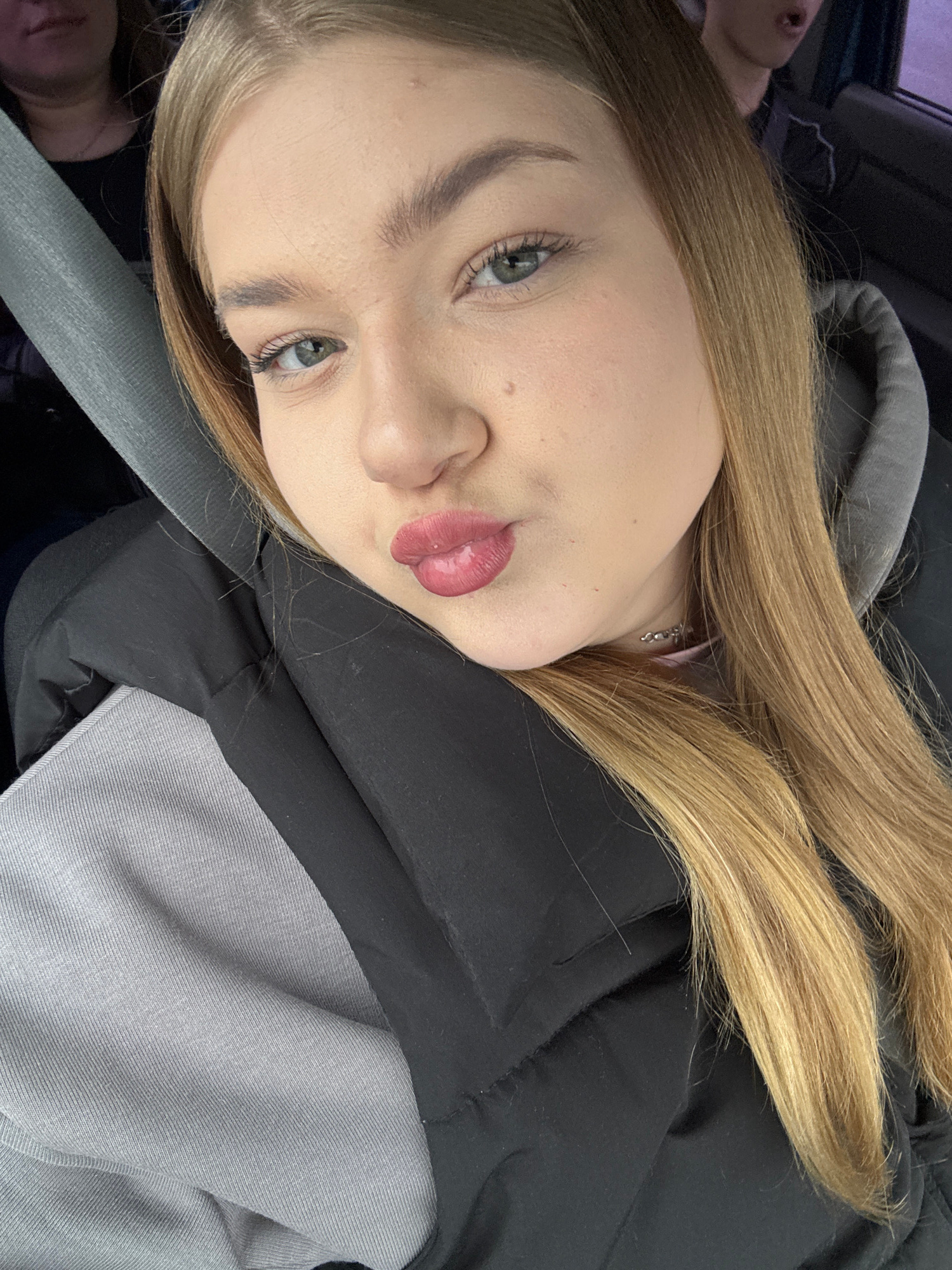 A young woman with blonde hair and light eyes is pictured indoors, seemingly in a vehicle. She is wearing a dark jacket and a grey hoodie, secured by a seatbelt. The location is unknown, and there is…read more