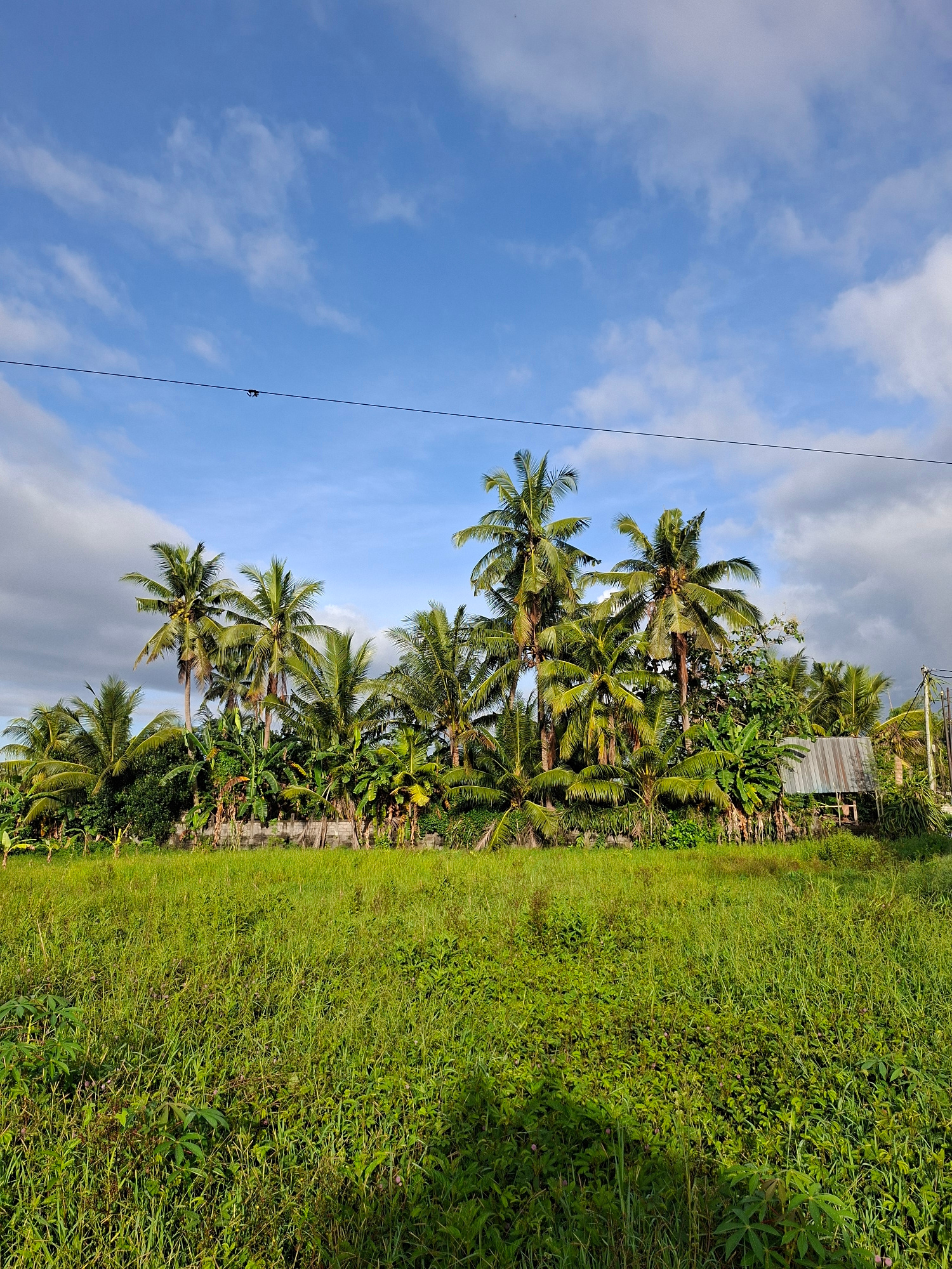 The image shows a scene in Lodtunduh, Indonesia. Several coconut trees line the border between a grassy area and a sky filled with blue and white clouds. A utility wire stretches across the upper left…read more