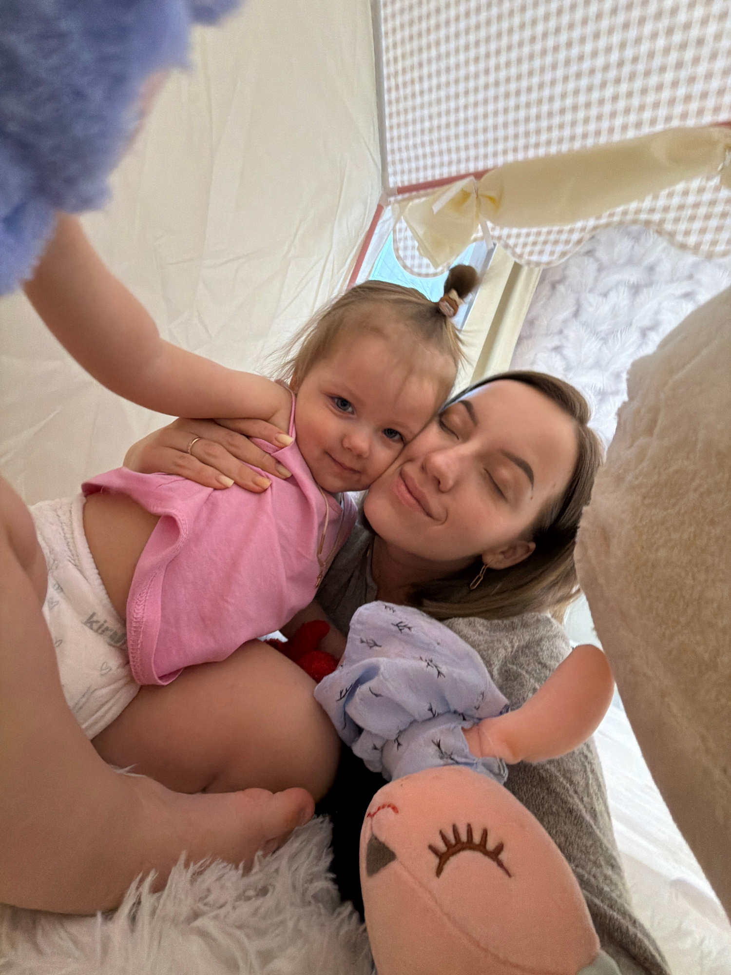 A woman with short brown hair and closed eyes is holding a baby with blue eyes, a pink shirt, and a diaper inside a fabric tent. The woman is wearing a grey shirt and a gold ring. A plush doll with a…read more