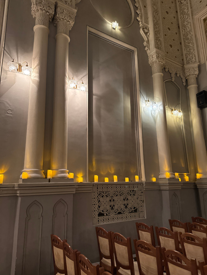 The image depicts the interior of a formal hall, identified as a section of the Brodsky Synagogue located at Shota Rustaveli Street, Kyiv, Ukraine. The environment is characterized by light grey wallsβ¦read more