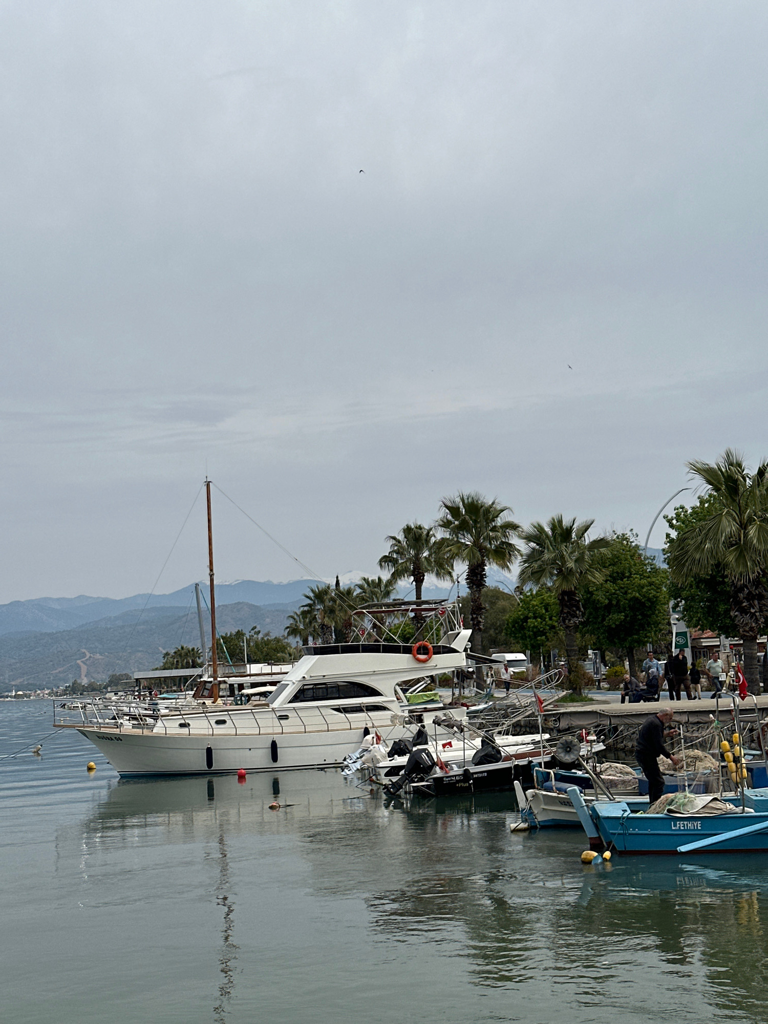 The image depicts a harbor scene in Fethiye, Turkey. It shows several boats docked along a pier on a cloudy day. A large, white sailing yacht is prominent in the foreground, its mast extending upward.…read more