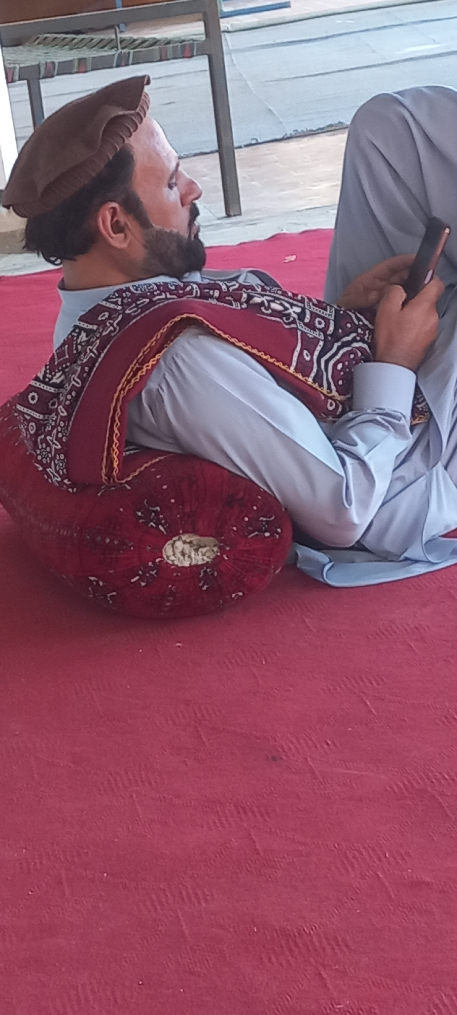 The image shows a man, likely in Muhammad Khel, Pakistan, holding a mobile phone. He is dressed in traditional clothing, including a distinctive patterned shawl draped over his shoulders and a brown c…read more