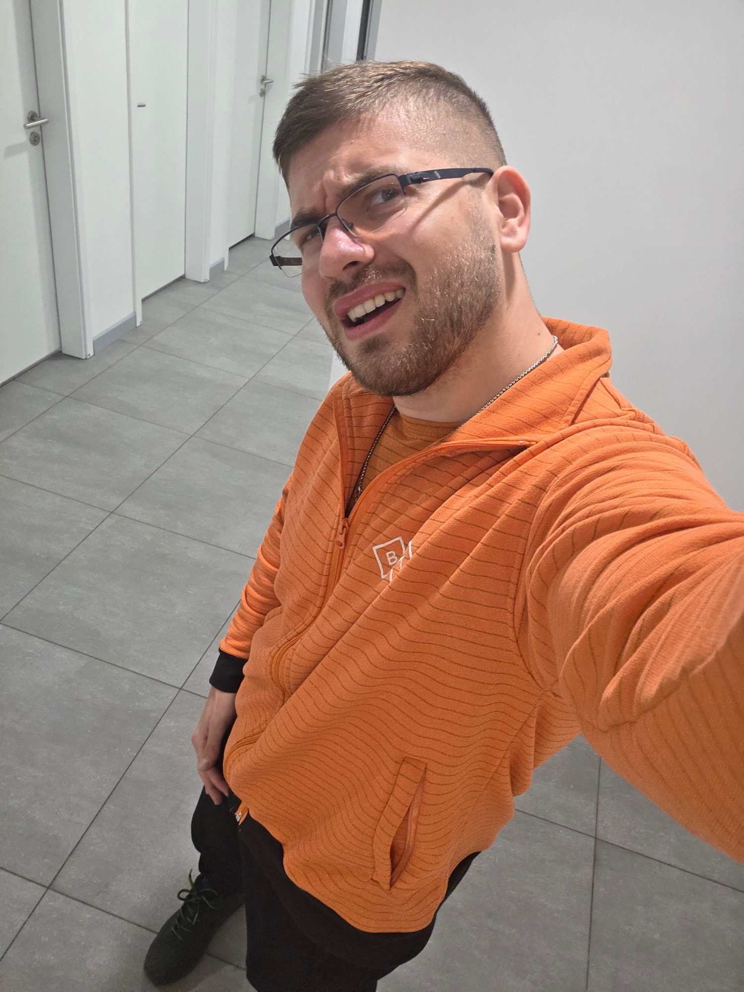 A man with short, light brown hair, a beard, and glasses is taking a selfie. He is wearing an orange hooded sweatshirt with black sleeves and pants. He is standing on gray tiled flooring, next to what…read more