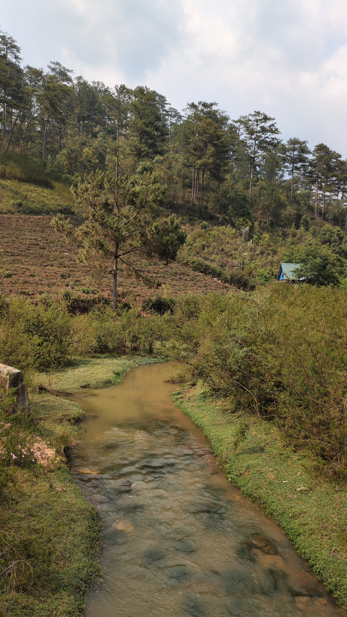 A landscape photograph, taken in Lạc Dương, Vietnam, shows a muddy river flowing through a lush environment. The river dominates the right side of the image. Vegetation, mostly green, lines the banks…read more