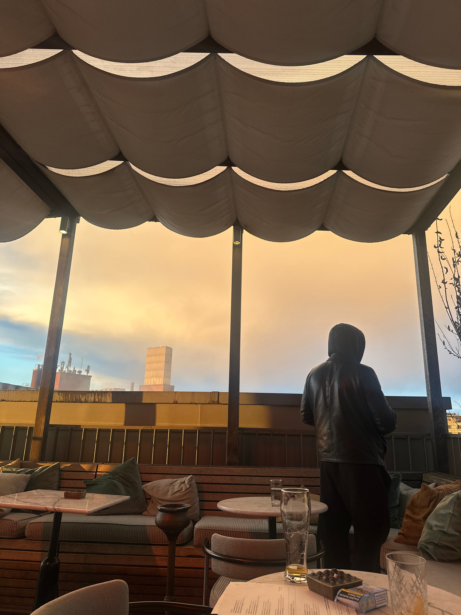 The image depicts a person in a black jacket standing on a balcony overlooking a cityscape under an orange and grey sky, likely at sunset or sunrise. The scene is framed by a ribbed, white awning abov…read more